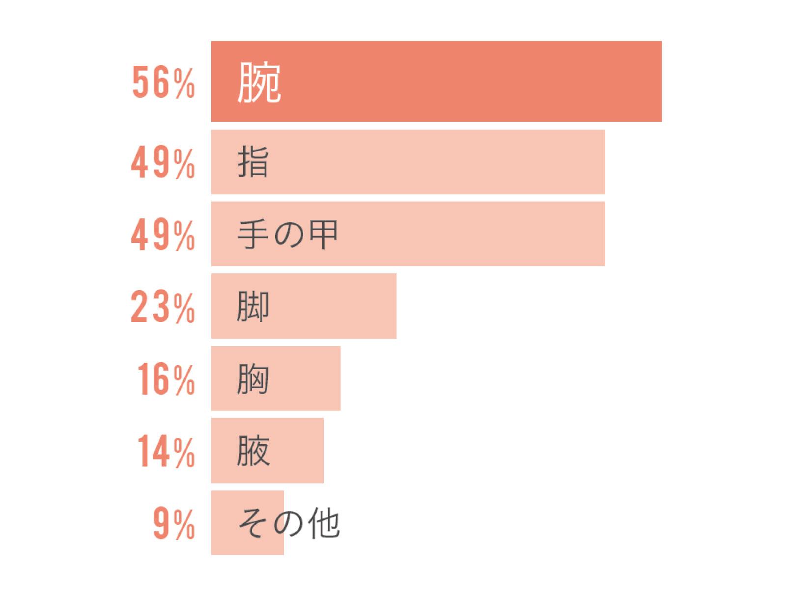 男性の体毛について、今回注目したのは職場での男女それぞれの視点。アンケートでは、女性に気になる部位を聞いたところ、腕、指、手の甲の毛がそれぞれ50%前後と高い割合に。