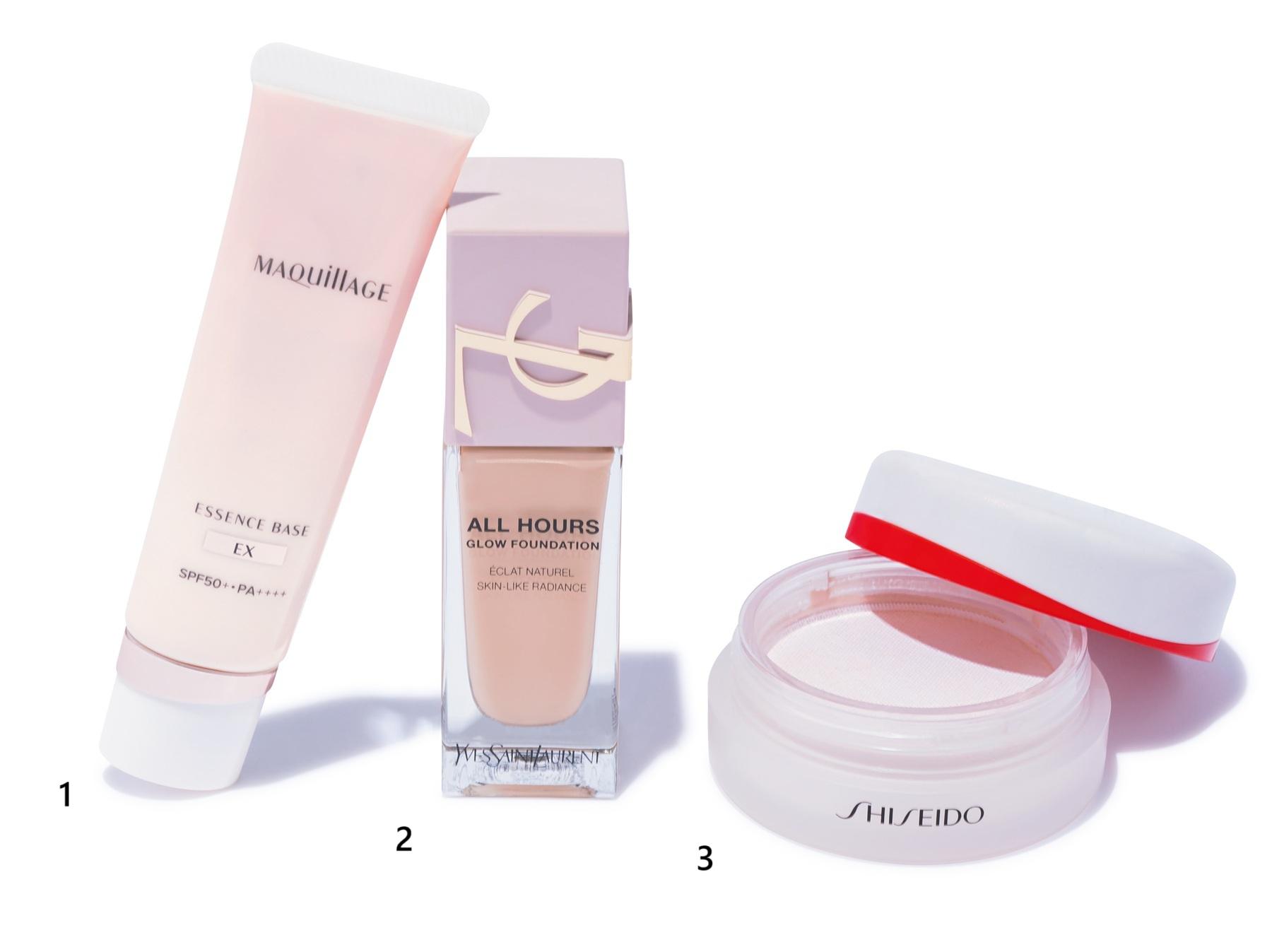 下地は、保湿力の高い3の“ベース美容液”をチョイス。ファンデも高保湿力が特徴な2のリキッドを。目の下の三角ゾーンに重ねづけすると、美肌印象がアップ。1のフェイスパウダーはブラシに取って肌全体にのせ、ふんわり感を出したい頬にパフでポンポン重ねる。