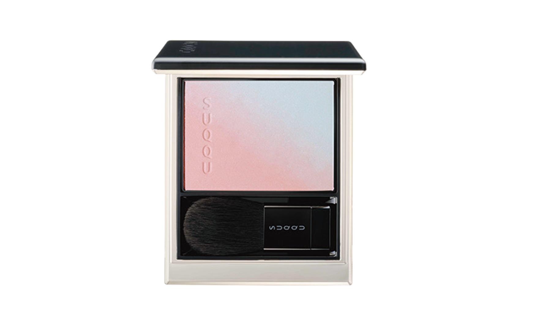 コーラルチークとブルーのハイライトをセット。光を拡散して肌のアラを隠す。