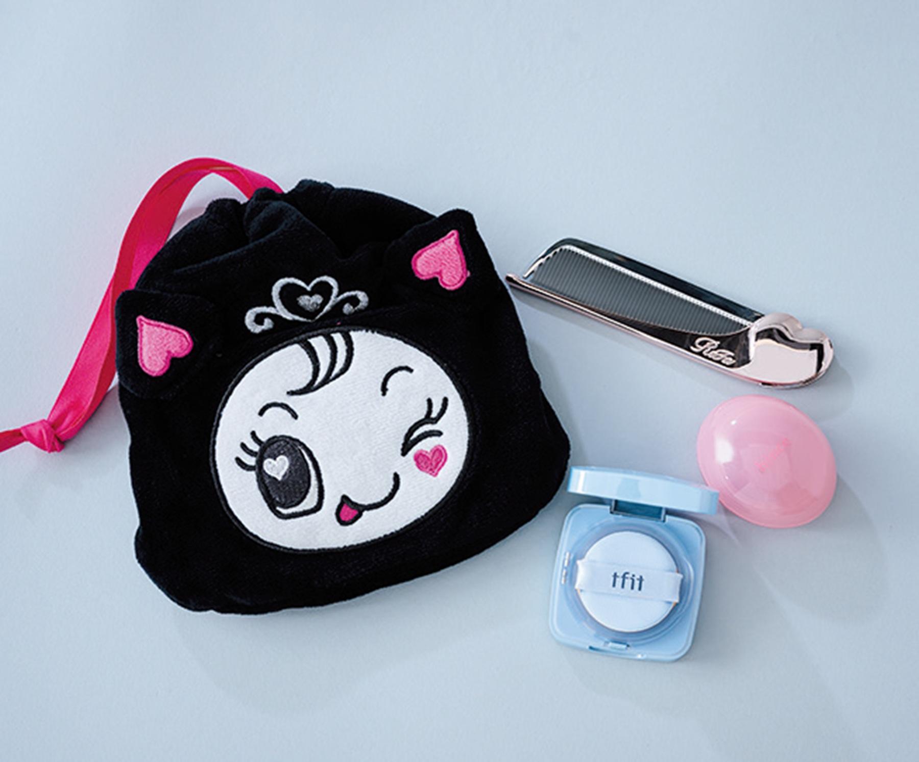 「ポーチは私が幼稚園くらいの時に流行っていた『メゾピアノ』。リバイバルした時のポップアップショップに並んで手に入れました(笑)。1つで2役のチーク&リップは『hince』、コンパクトなサイズ感でお直し用として持ち歩くのにぴったりなクッションファンデは『TFIT』。韓国コスメはパッケージがかわいいところもお気に入り。『ReFa』のコームは髪がツヤツヤサラサラに♡」