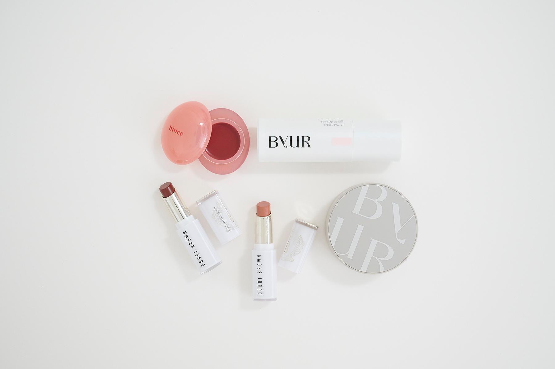 左から時計回りに:hince ロウグロウデューイーボール 08 ¥1,815(hince HP:https://hince.jp/)、バイユア セラムフィット シャイニング トーンアップクリーム V1 ピンクベージュ ¥2,860、バイユア セラムフィット シルキー ヌード クッション #21 ナチュラルベージュ ¥3,960 (ByUR HP:https://byur.jp/)、ボビイ ブラウン エクストラ カラー シャイン 670、678 各¥5,060(ボビイ ブラウン TEL:0570-003-770)