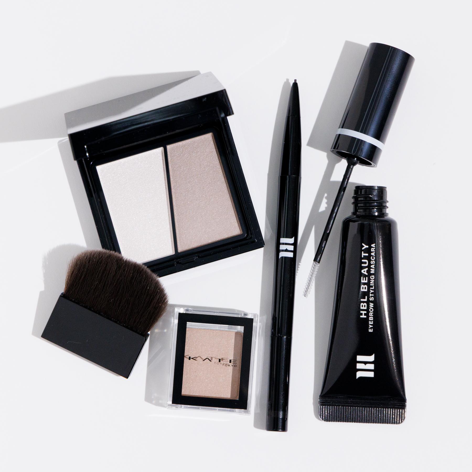 左から順に:ケイト 3D クリエイトニュアンスパウダー EX-1 ¥1,540、ケイト ザ アイカラー M121 ¥770 ※ともに編集部調べ(カネボウ化粧品 TEL. 0120-518-520)HBL アイブロウ エンドペンシル0.8 02 ディープ ¥1,980、アイブロウ スタイリングマスカラ 01 クリア ¥3,960(JULIA IVY HP https://hbl-jp.com/)