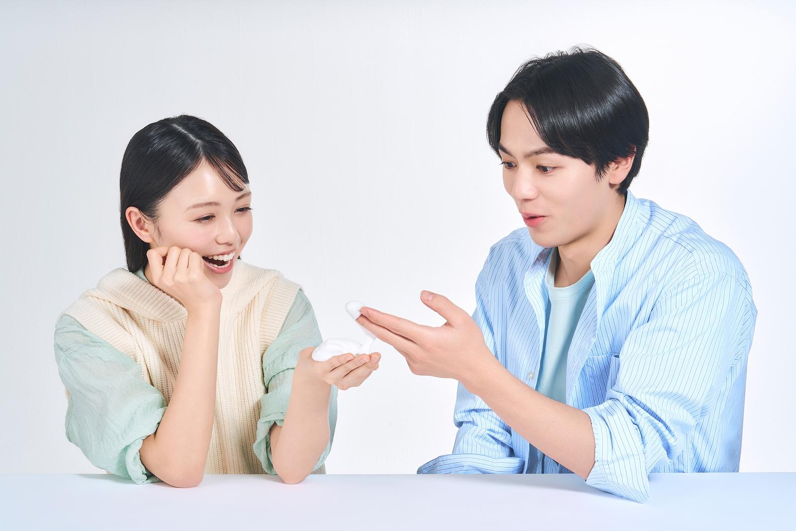 ウオッシングのふわふわした泡も体験! 「モッコモコでずっと触っていたくなります! この泡に包まれながら洗うのが⾄福…」(藤咲さん)、「やわらかな泡が気持ちよくて、洗った後に肌がうるおう設計もうれしい」(相原さん)