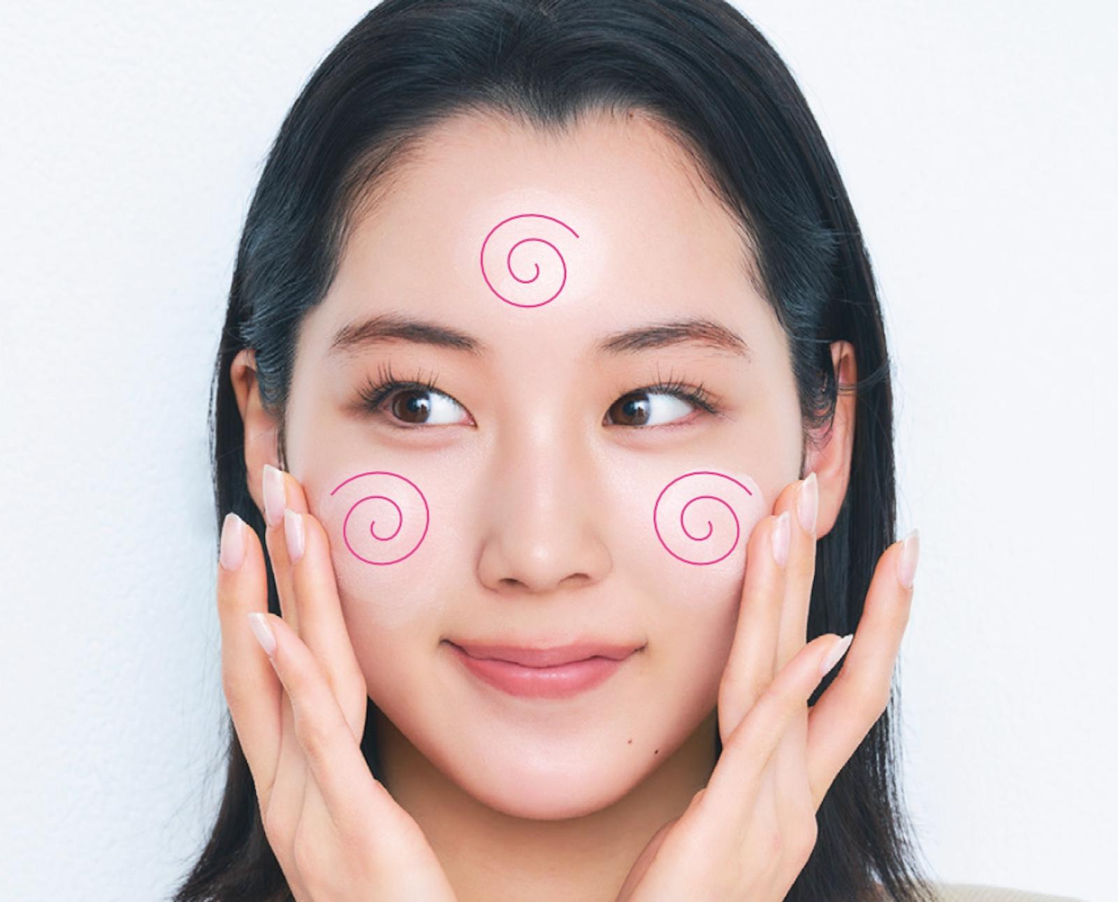 頬と額からクルクル広げてスキンケアのようになじませる/下地を体温となじませるように指に取り、両頬と額に円を描くようにのせ、スキンケアをなじませるようにクルクルと広げる。細かい部分は指の腹で丁寧に。