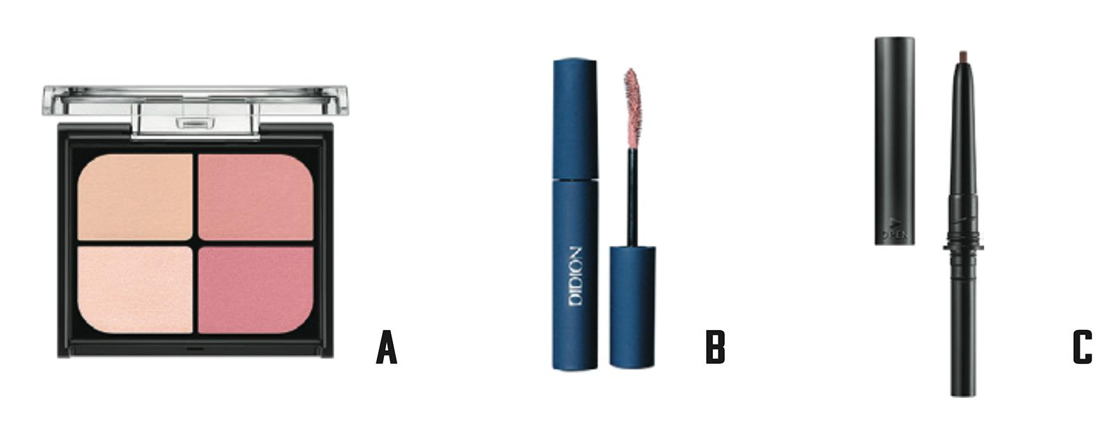 「アイホールにAの右下の青みピンク、眉毛下と涙袋にAの左下のラメをプラス。まつ毛と眉毛はピンクベージュのマスカラで色の統一を。チークはCゾーンから広めに入れ、アイラインはこげ茶で引き締めて抜け感を」(辻村さん)