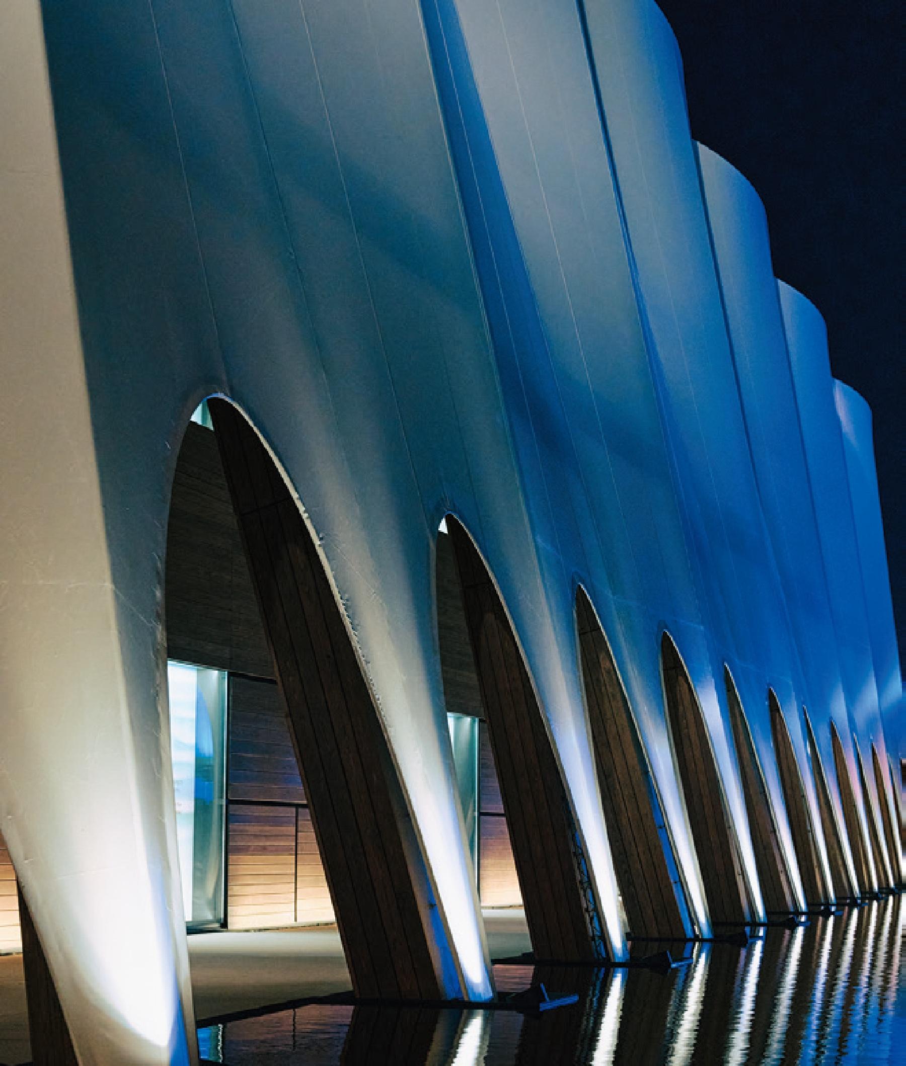 青色の光に照らされるカタール館は、より神秘的な雰囲気に。
