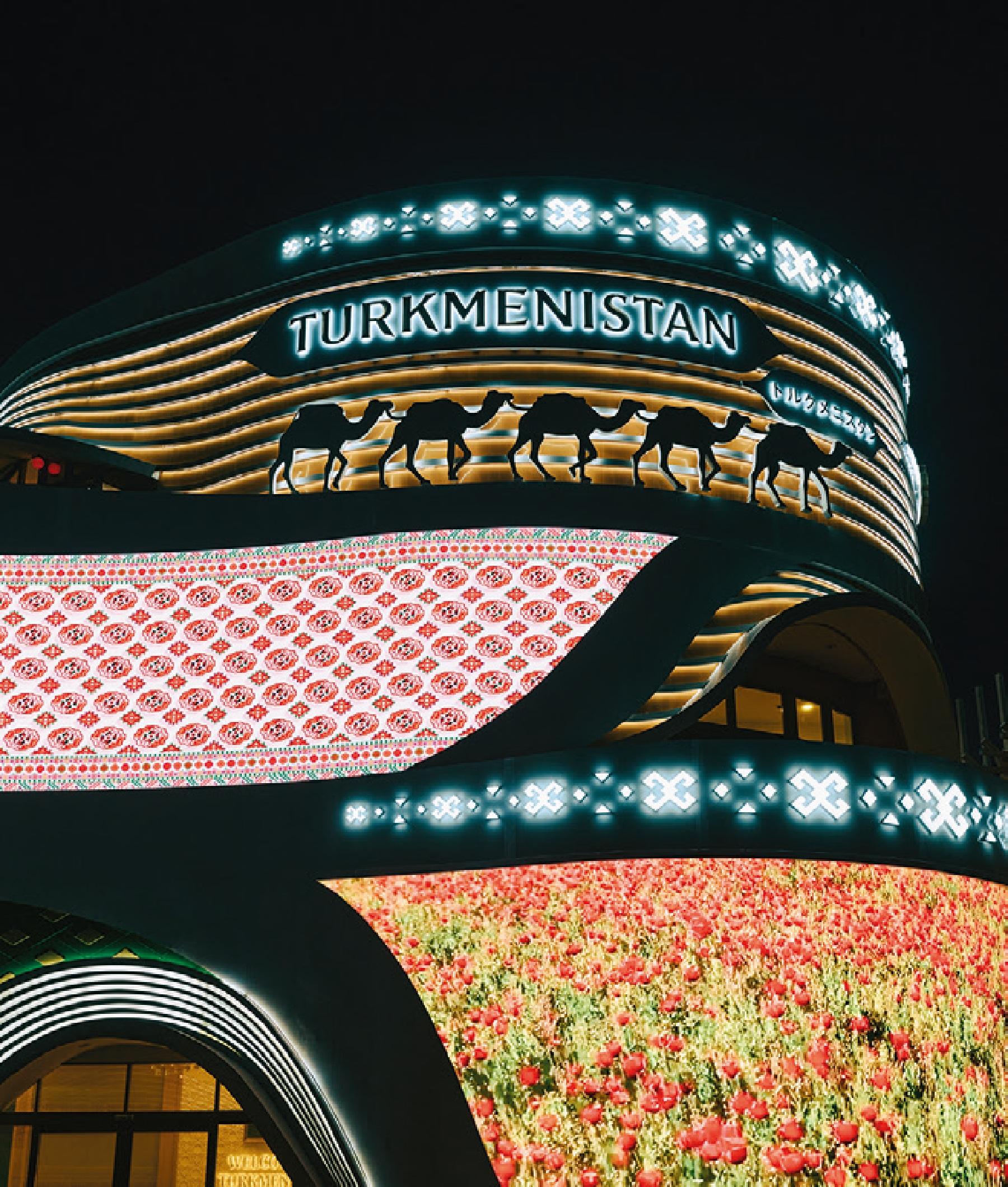 夜に映えるトルクメニスタン館。宮殿のような外壁のスクリーンに色とりどりの映像が。