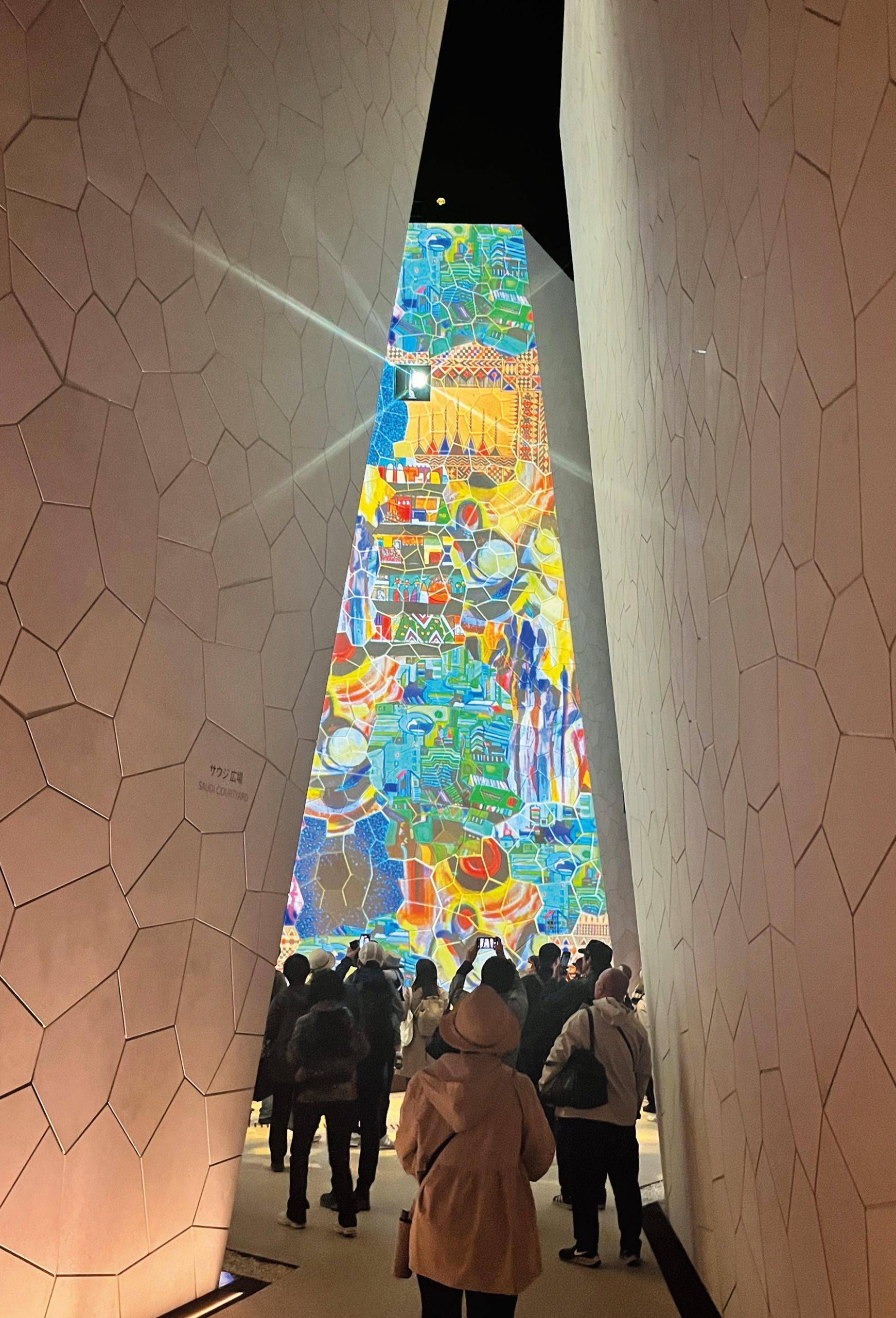 石造り風の建物のサウジアラビア館。路地の先の広場の壁面に、カラフルな映像が映し出される。