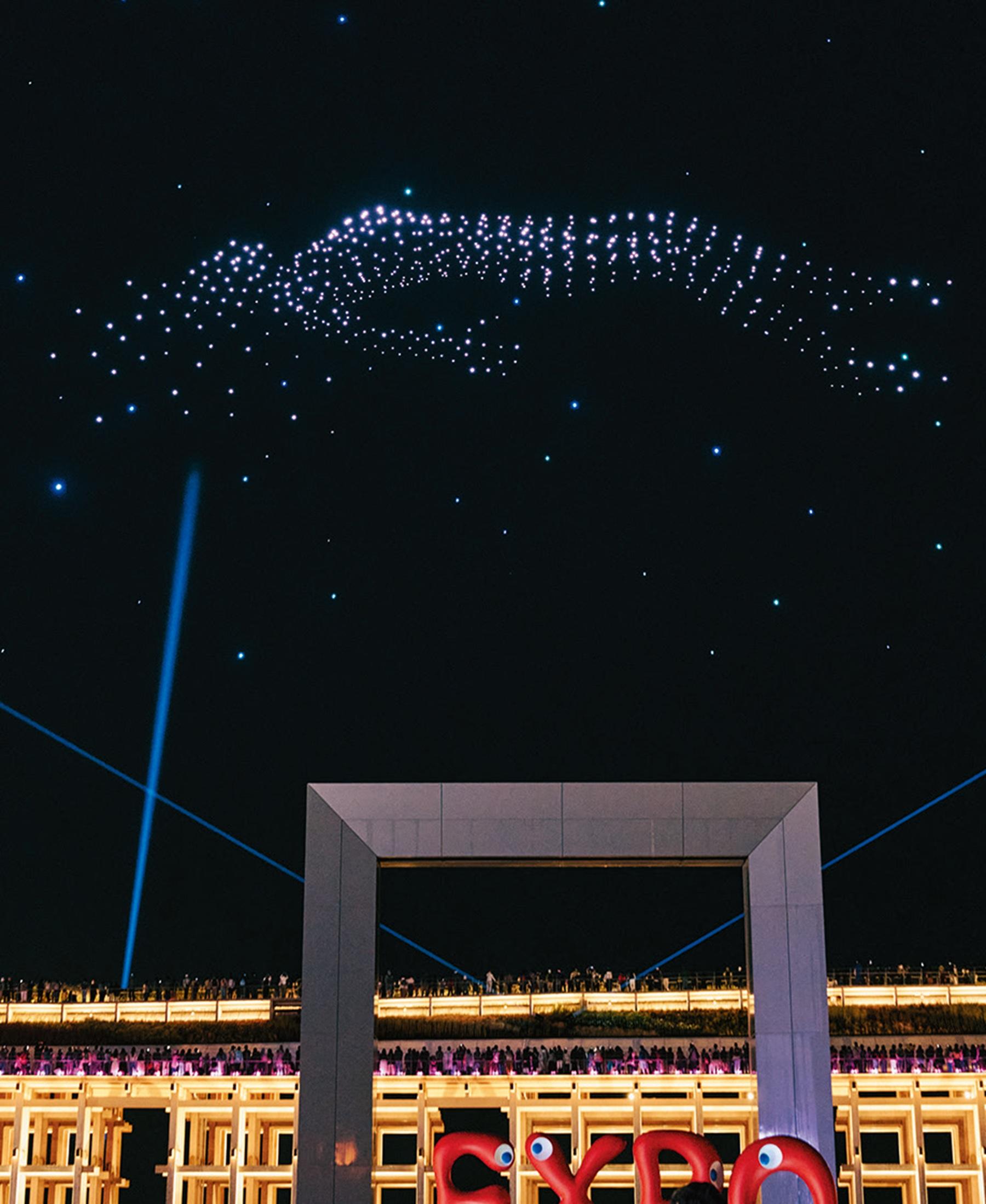 1000機ものドローンが一糸乱れぬ姿で、夜空に様々なモチーフを描く。