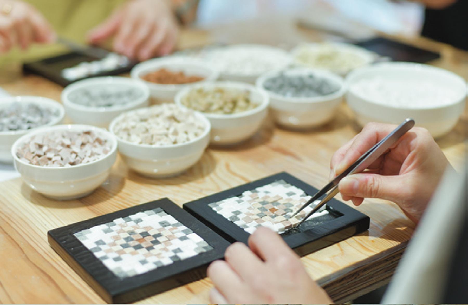 モザイクアートなど、ヨルダンの伝統的なハンドクラフトを体験できるワークショップ(有料)も人気。