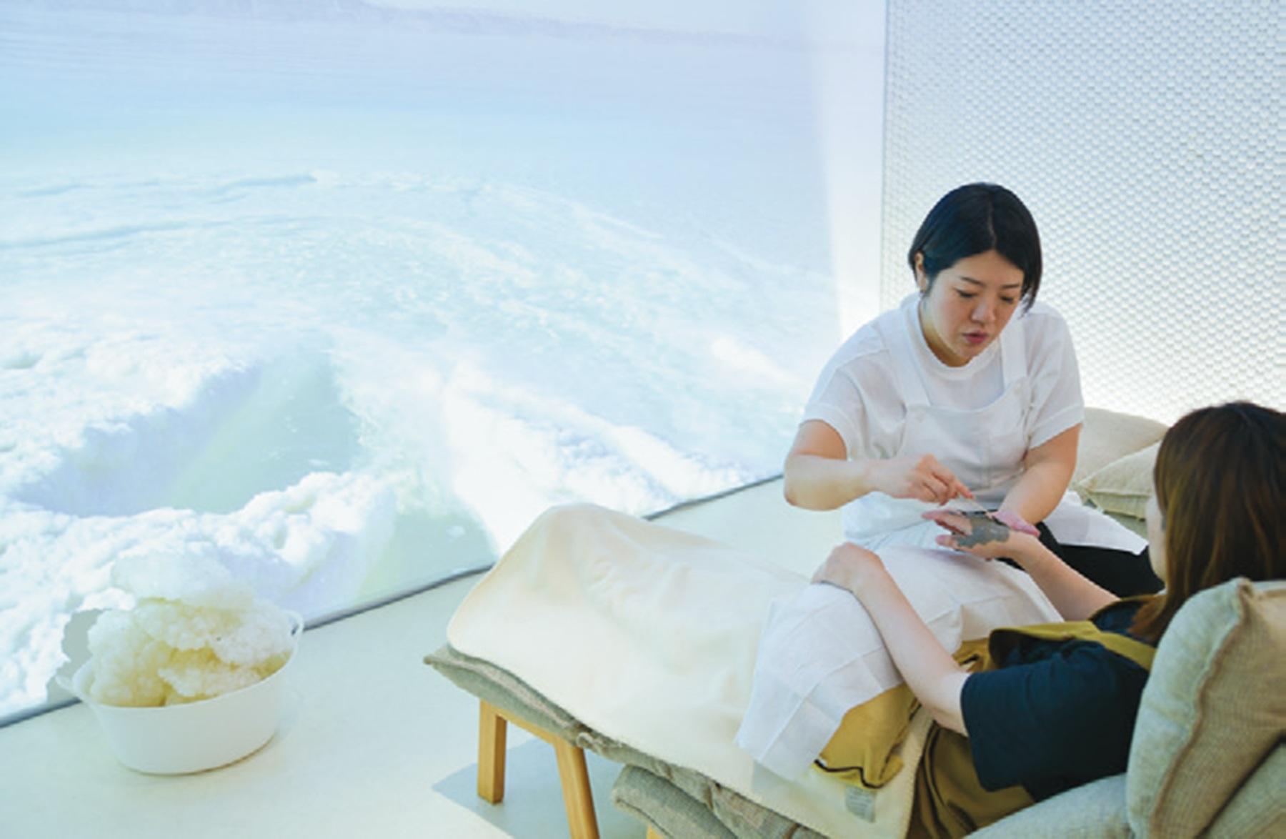 館内にはスパルームを完備。目の前に広がる死海の大パノラマ映像を見ながら、死海の塩や泥を使ったハンドマッサージ20分¥2,500~が受けられる。毎日先着予約制。