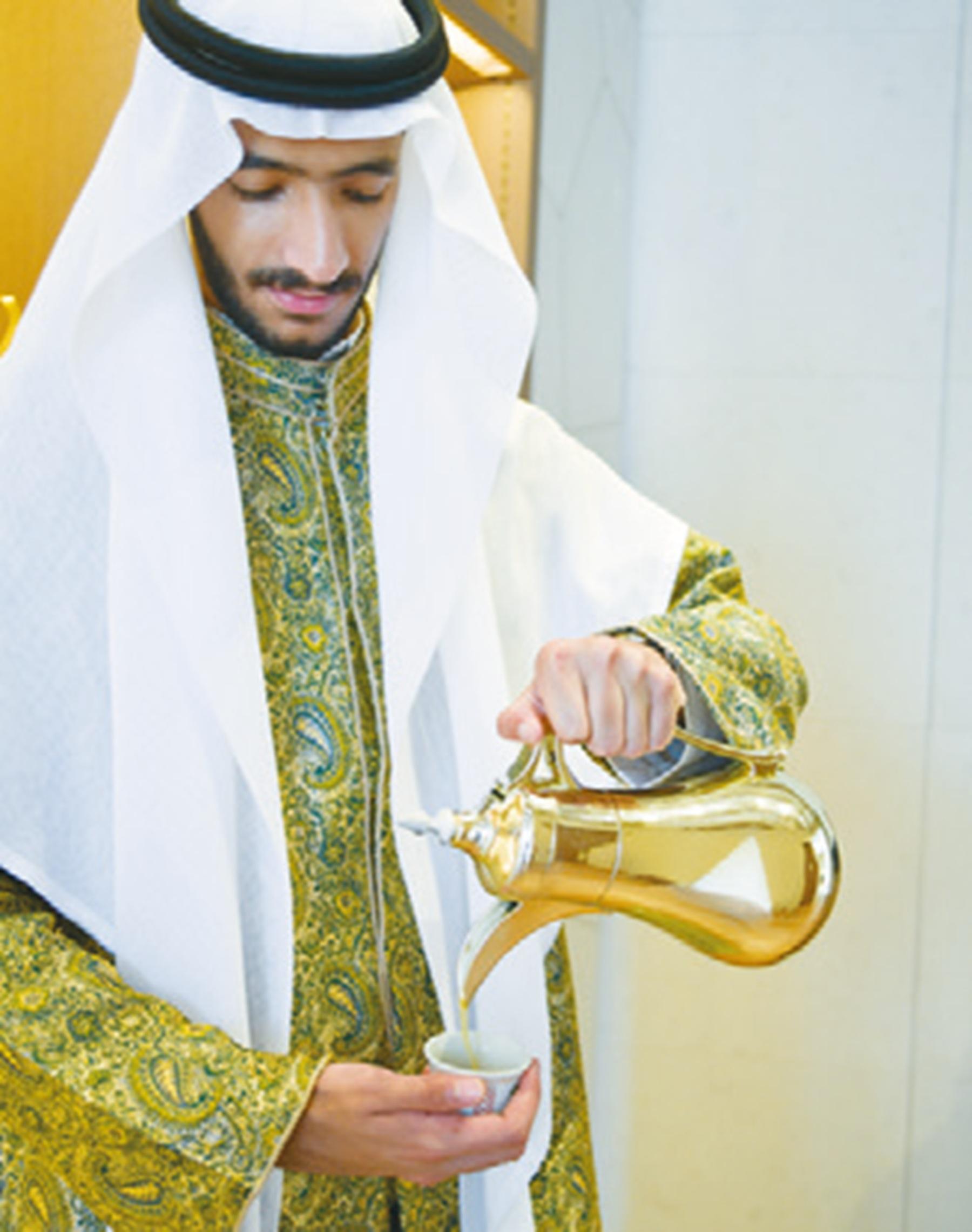 レストランの入り口で振る舞われるサウジコーヒー。カフェでは1杯¥700で提供。