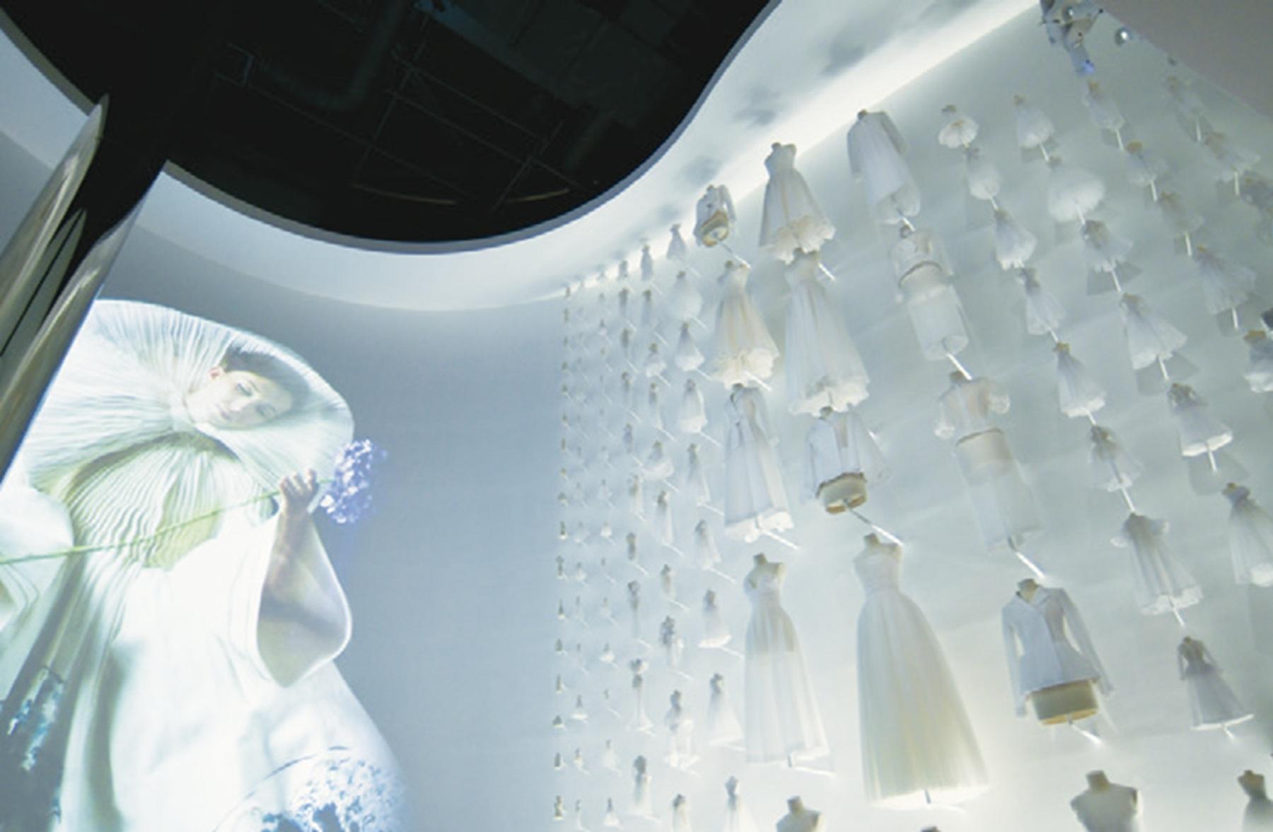 ディオールのシルエットのスケッチを立体的に表現した約400点の白いトワルと、3Dプリントで再解釈したフレグランスボトルの展示。アーティストの高木由利子さんの作品が空間に華を添える。