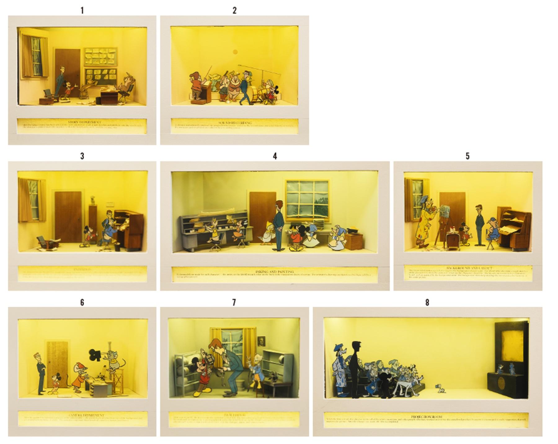 映画が完成するまでの過程をジオラマで紹介。【1】物語を練る「ストーリー部門」、【2】音声を収録する「サウンドレコーディング」、【3】キャラクターに命を吹き込む「アニメーション」、【4】セル画を仕上げる「インキング&ペインティング」、【5】背景を描き、キャラクターの大きさを決める「背景&レイアウト」、【6】背景とセル画を重ねて撮る「カメラ部門」、【7】物語のリズムを作る「フィルムエディター」、【8】作品を固める「映写室」。