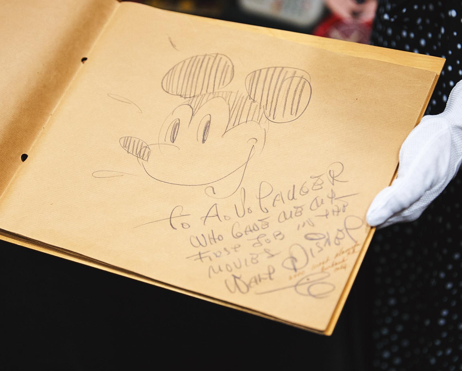 特別に見せていただいた資料の数々。なかでも特に貴重だと紹介されたのが、滅多にミッキーを描かないことで知られるウォルト直筆のミッキーマウスのイラストと、「世界初の絵コンテ」とされるミッキーのスクリーンデビュー作『蒸気船ウィリー』の絵コンテ。