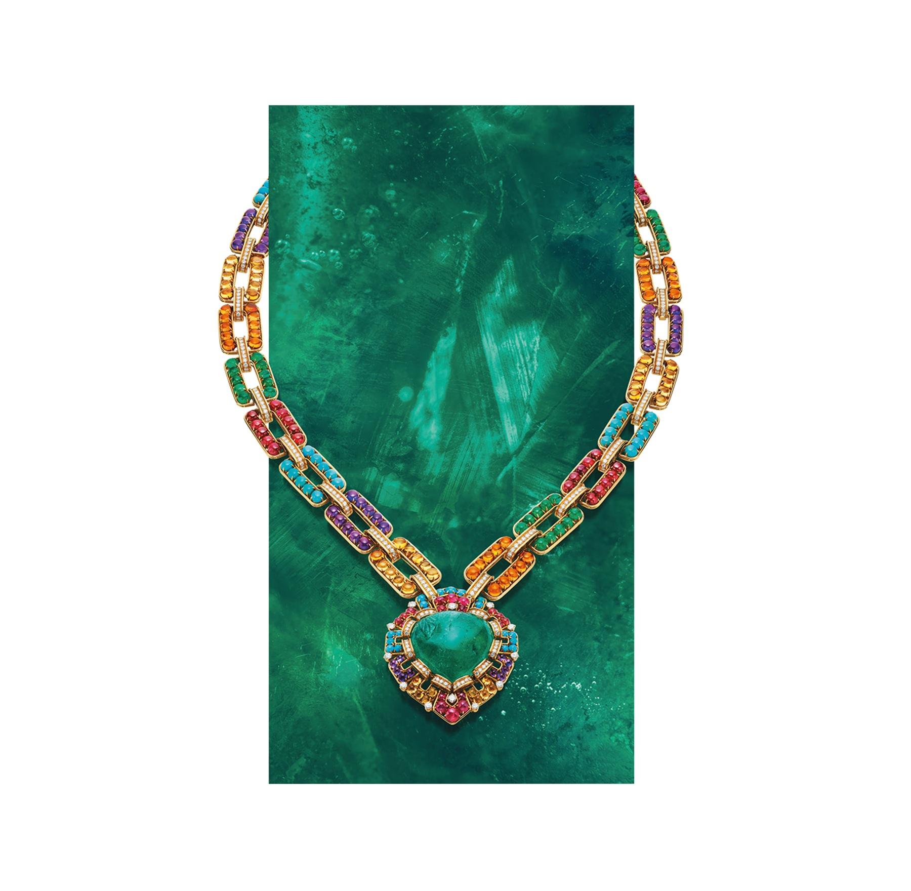ブルガリのジュエリーの特徴は、圧倒的な色彩の美しさにある。1950年代、ハイジュエリーといえばプラチナを用いた単色が一般的だった時代に、ブルガリはイエローゴールドにサファイア、ルビー、エメラルドとダイヤモンドを合わせるなど大胆なコンビネーションを開拓。また、当時はあまり使われていなかったアメシスト、シトリン、ターコイズなども取り入れ、鮮やかな色彩で他にはない宝飾品の美を追求した。