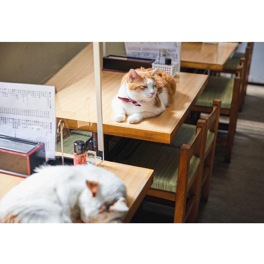 そんな二匹の朝のルーティンが、メニューサンプルを飾った店先のショーケースの中に入って日向ぼっこをすること。招き猫のようにメニューと並ぶ様子が愛らしく、これがSNSで注目を集めるきっかけに。