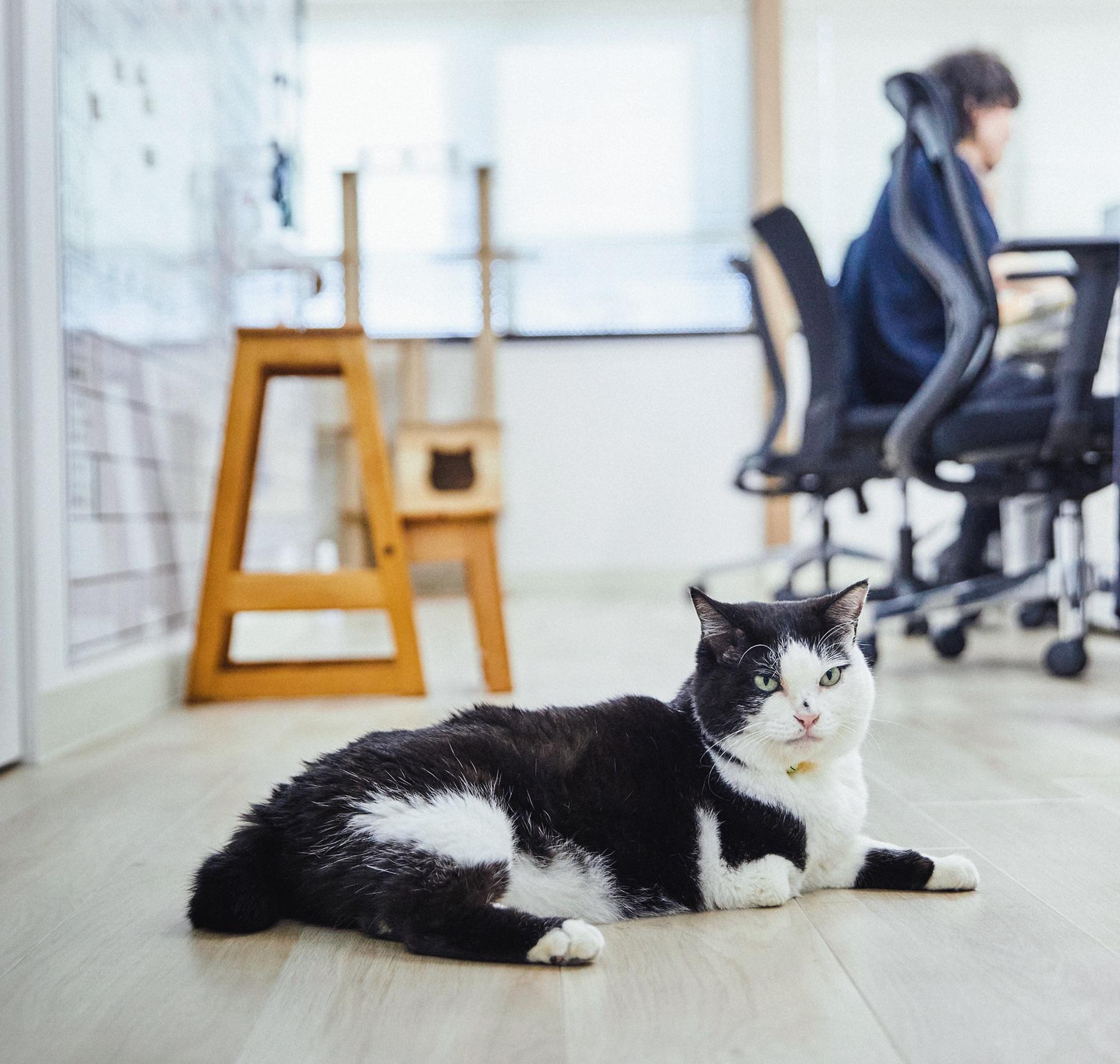 ハンデを物ともせず、福を運んできた会社猫・ふく(ミックス/推定13歳/♀)。今日もまったりと、“広報部長”は社員の仕事ぶりを監視中!?
