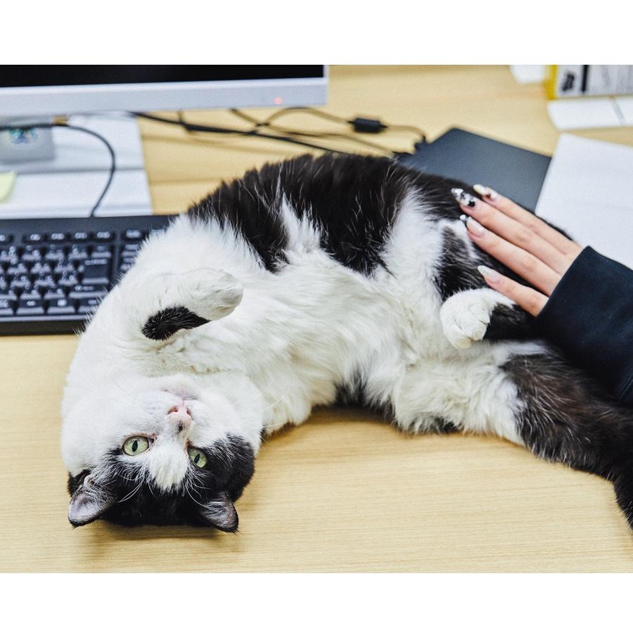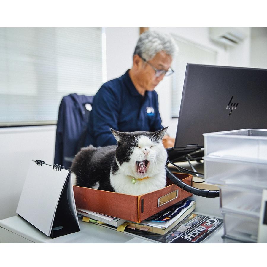 「発見時、すでに右の前脚を失った状態でした。治療が終わったら里親を探すつもりだったのですが、すっかり懐かれてみんな離れがたくなり、会長や社長に頼み込んで会社に迎えることになりました」と教えてくれたのは、常務取締役の清水あゆみさん。いるだけで空気を和ませ、社員だけでなく得意先の人たちにも愛されているふくさんは、今や日章の“広報部長”。2年前から始めた会社のInstagramでは、宣伝活動をしっかりこなし、なんと16万人超ものフォロワーを獲得!