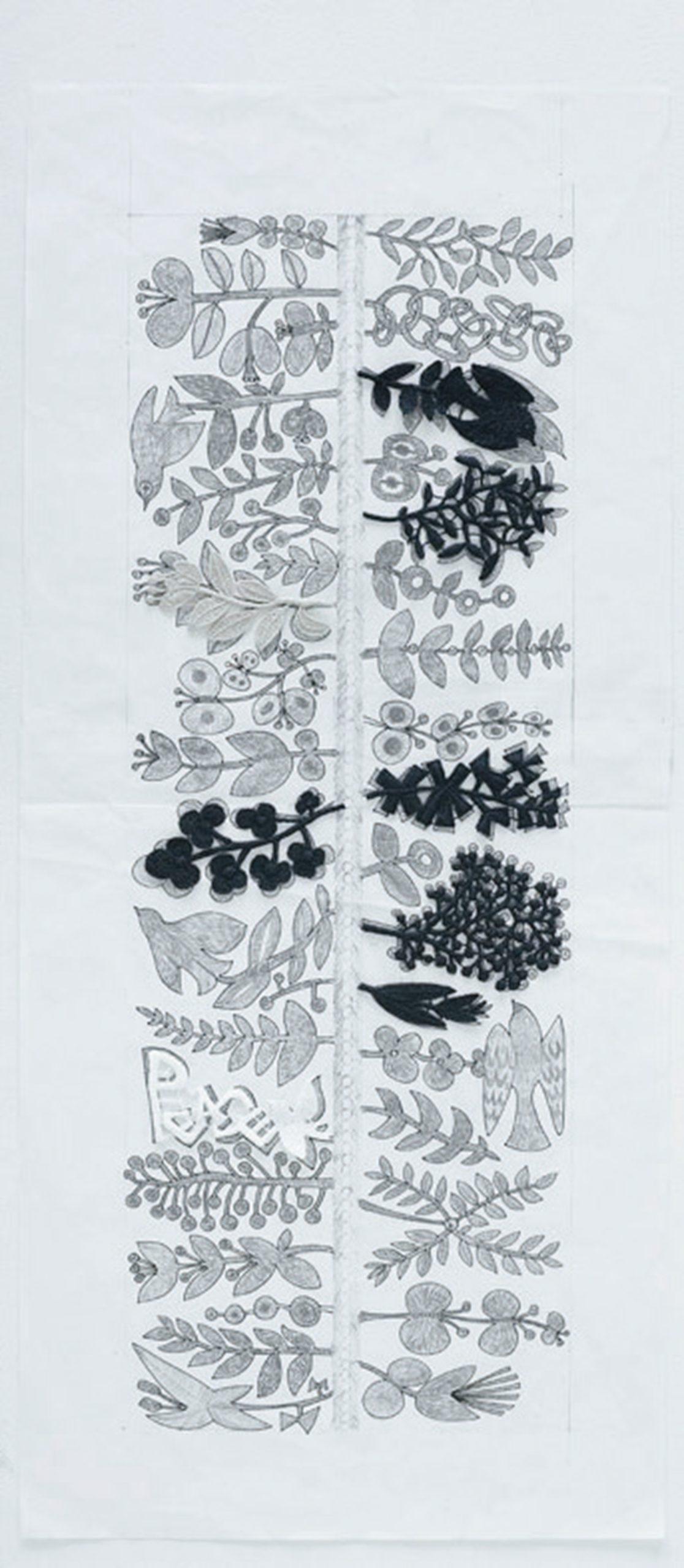 〈“forest parade”2005→s/s 原画と刺繍パーツ Photo:sono(mame)〉草花や鳥など37種類のパーツが立体的に房のように連なる刺繍のためのデザイン画