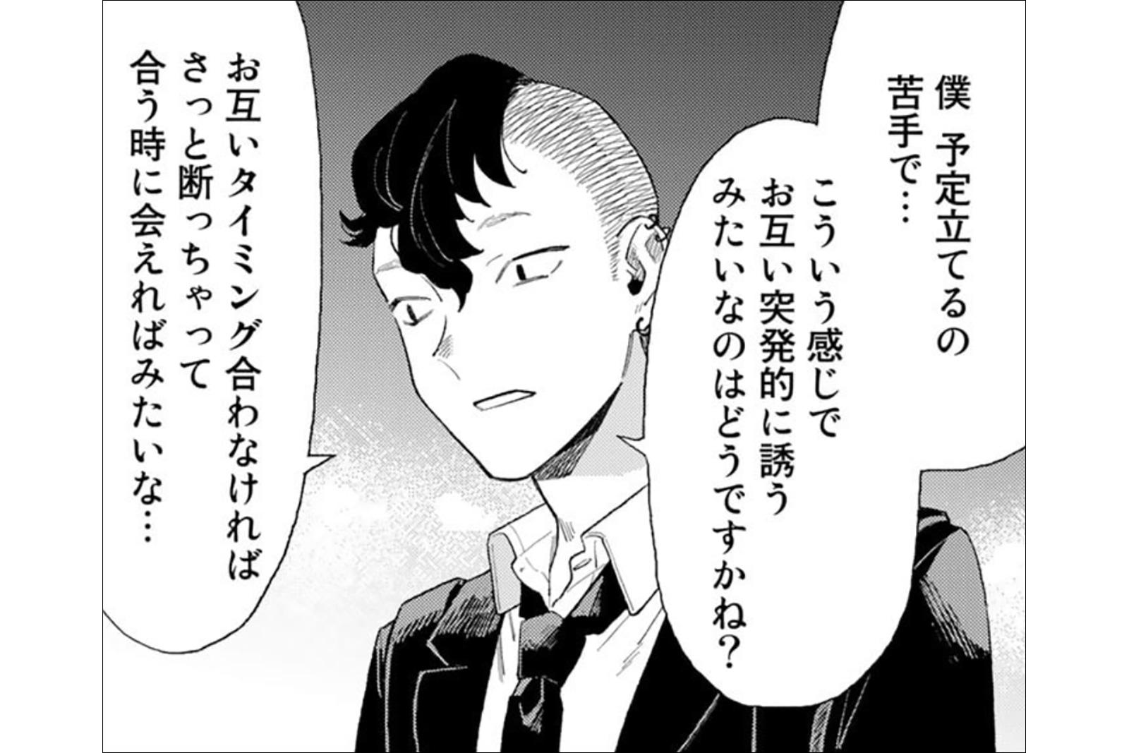 2~3年前、編集者と会ったり、企画を考えたり…みたいなことを積極的にしていた時期があったんです。みなさんと話をする中で、特に20代の人の“マッチングアプリでの出会いに疲れている”感がすごく強くて…。それで、今この作品を担当してくれている編集者さんと「ごはんを食べに行くだけの関係ならラクでいいのに」という話になったことが、最初のきっかけです。