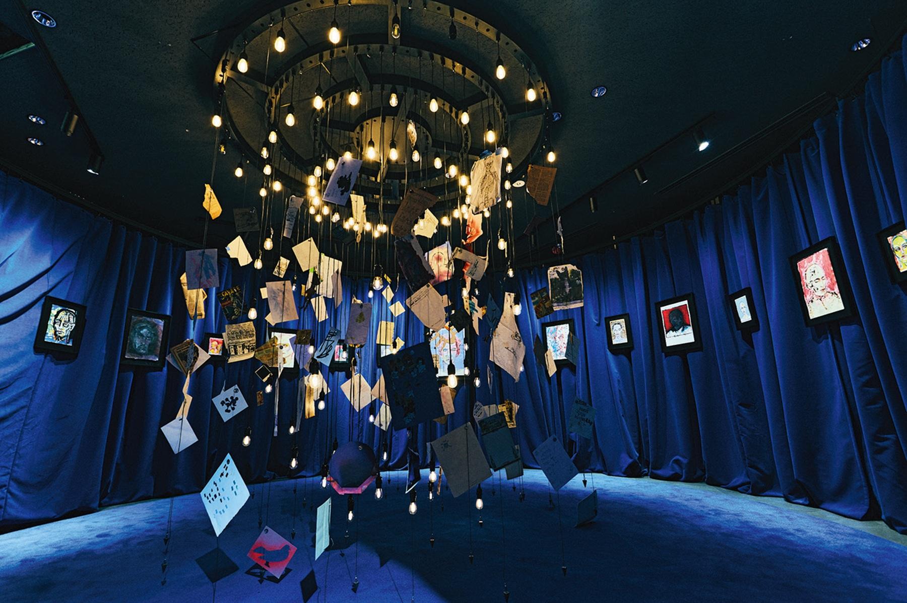 最初の展示空間「ザ ホワイトボックス」では、彼が世界中に構えるアトリエスタジオや、20代から現在に至るまでに制作した60点以上の作品が自宅から集められ、5つの異なる空間で展示される。各空間は光や音、絵の具の匂いなど、印象的なアイテムが記憶に残る斬新な演出に。私物やメモ書きなど本邦初公開の資料も点在しており、彼の試行錯誤の断片を目にすることができる。