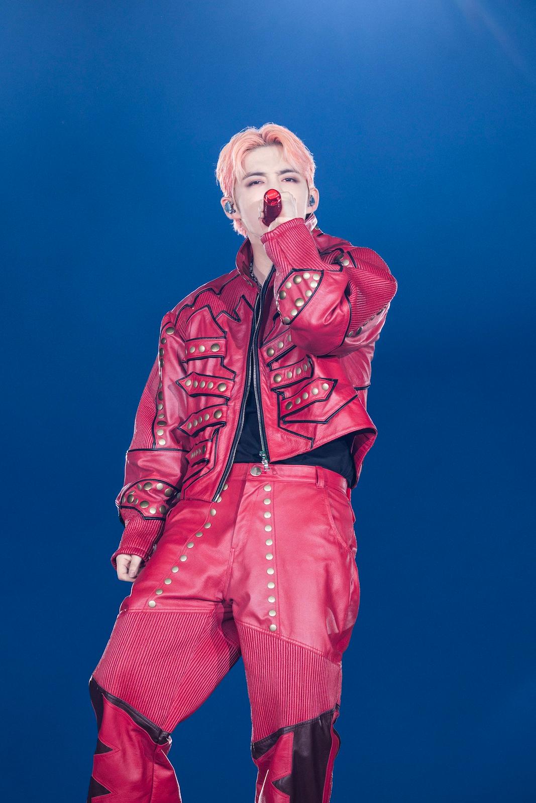 S.COUPSのソロ曲「Me」は本⼈が考案したという⾚⿊く染まった薔薇が絡まるマイクスタンドで歌い上げる姿が印象的。「僕にとって『Me』はとても悲しい曲だったんですが、CARATの前で繰り返し歌っていると、悲しさよりも幸せな気持ちのほうが⼤きくなってきました」とうれしそうに語った。