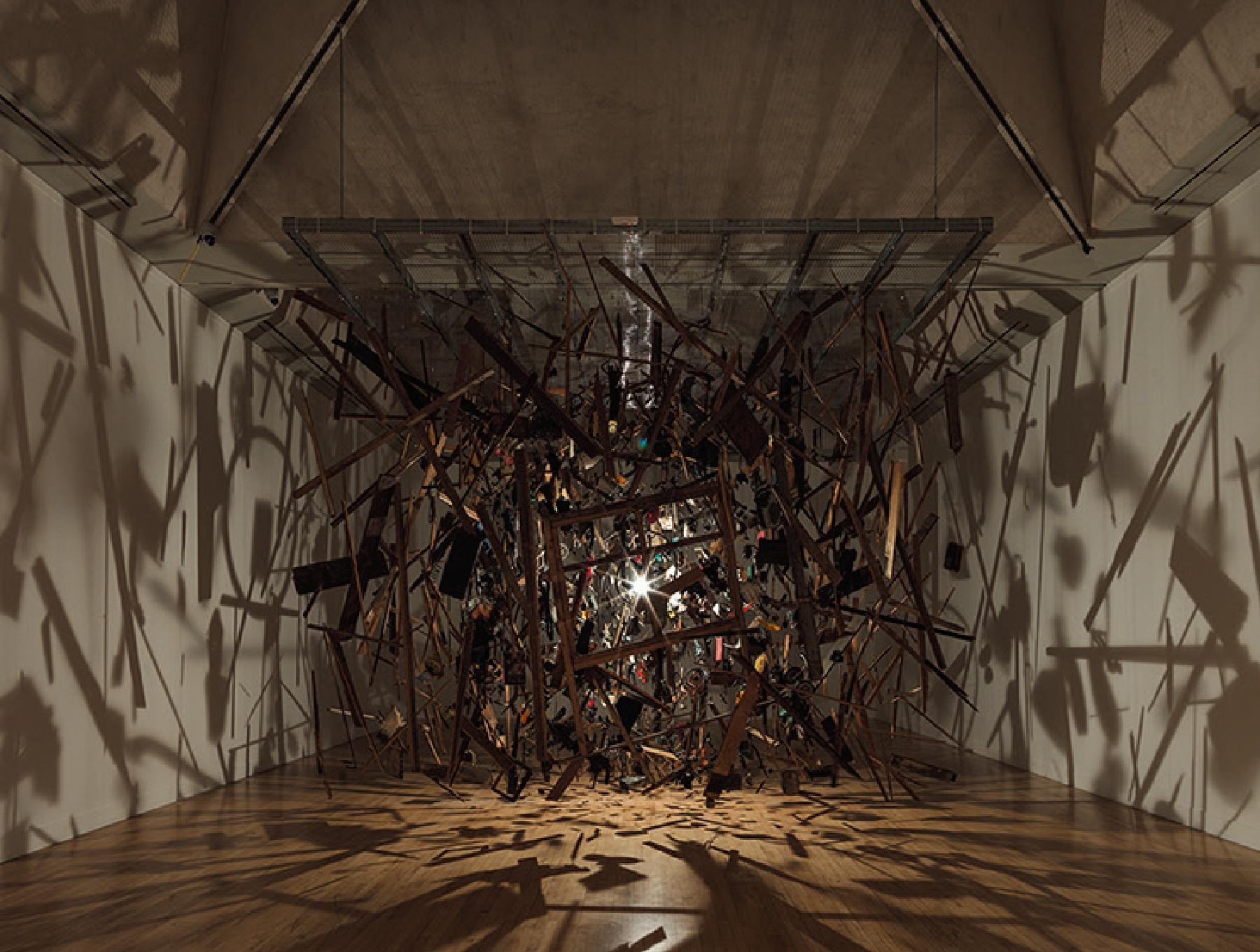 日常のものを大量に集め、時に変形させ、天井から吊るすスタイルの彫刻作品などで知られる。/コーネリア・パーカー《コールド・ダーク・マター:爆発の分解イメージ》1991年、テート美術館蔵 Photo: Tate (C)Cornelia Parker. Courtesy Frith Street Gallery,London