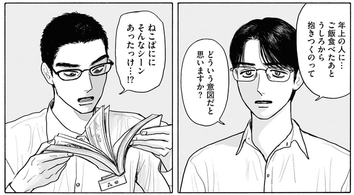 本作では登場人物がぐんと増え、『カラオケ~』より構成の複雑さが増している。聡実のバイト先の先輩でマンガオタクの森田さんや、深夜にアシスタント連れで仕事しに来るコワモテのマンガ家・北条麗子先生、なぜか狂児の周りを嗅ぎ回るヤクザネタを得意とするライター・岡田、北条先生の担当編集の鈴木さんなど、聡実の平凡な日常をかき回す存在があちこちで波風を立てていく。しかも、彼ら彼女らの意外なつながりは、のちのちわかってくる。関係性発覚の波状攻撃に、ニヤニヤ笑いが止まらない。