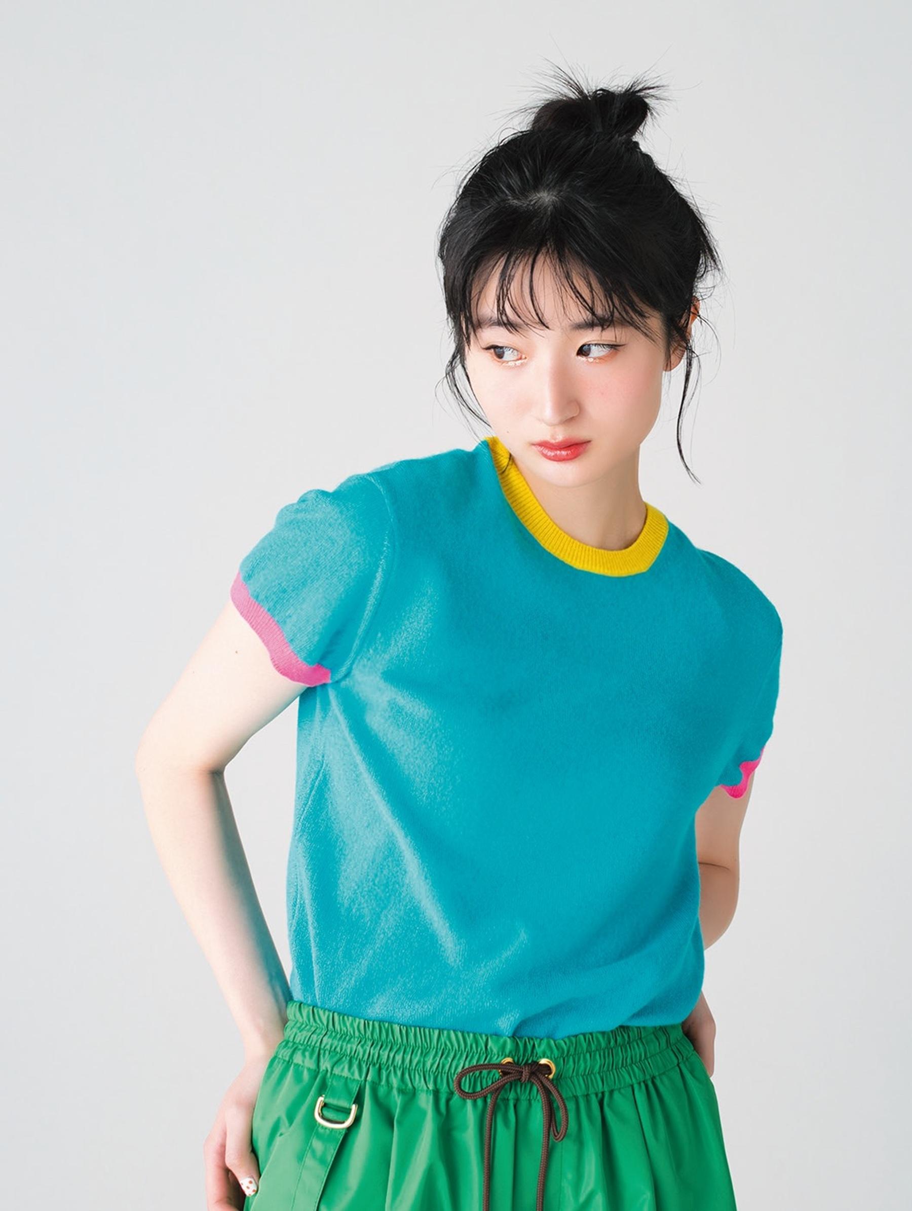 襟と袖口の配色がきいた、カシミア100%のニットTシャツ。スタイリスト安西こずえさんとニットブランド『WRAPINKNOT』のコラボライン。