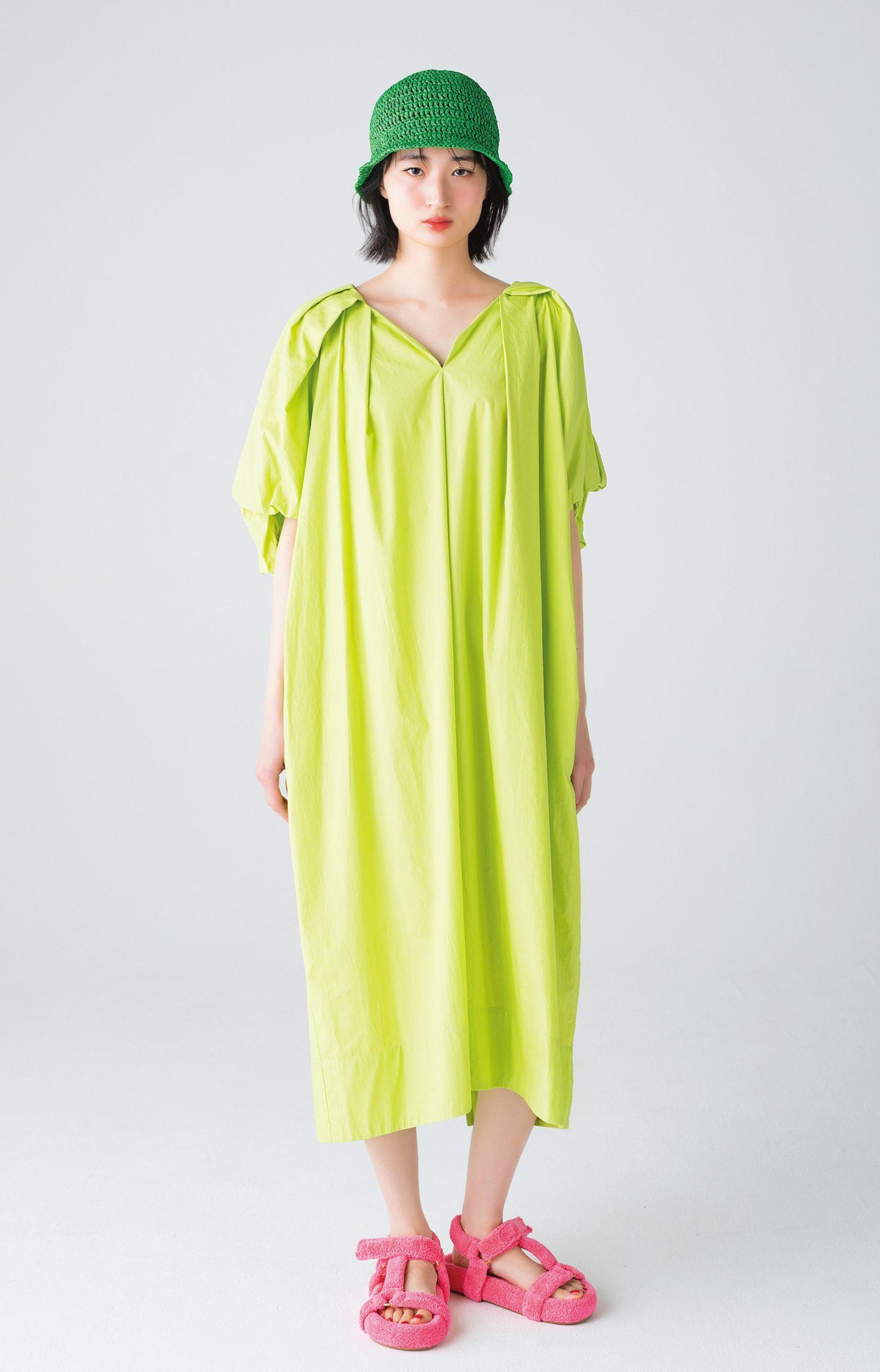 フレッシュなグリーンのワンピースは、オーガニックコットン製。程よいハリ感とゆったりとしたシルエットで、洗練された雰囲気とカジュアルさを併せ持つ。合わせる小物もビビッドなカラーを選んで、とことんエッジのきいたスタイルに。
