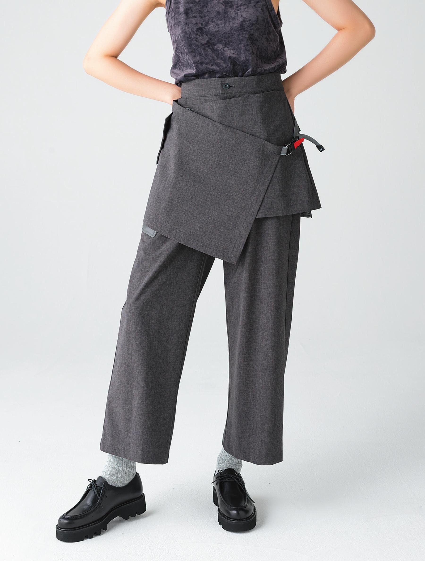 マグネットで開閉できるラップスカートがドッキングしたレイヤードパンツ。ウォータープルーフ機能や防風性を兼ね備え、雨の日のきれいめスタイルに重宝。