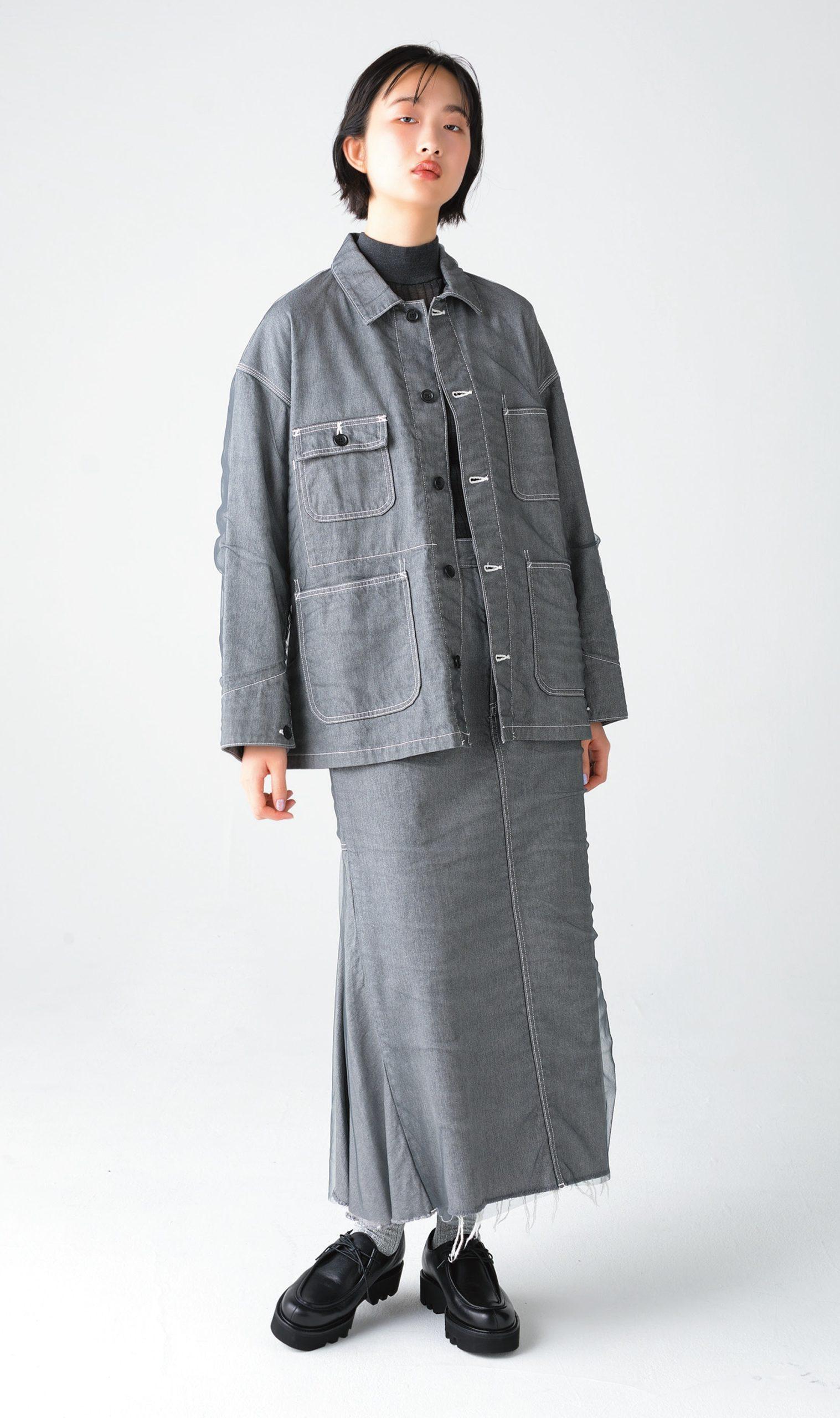 デニムのカバーオールに、ブラックチュールを重ねたオリジナリティあふれるデザイン。お揃いのスカートとセットアップで着こなせば、コーディネートの完成度がさらにアップ。