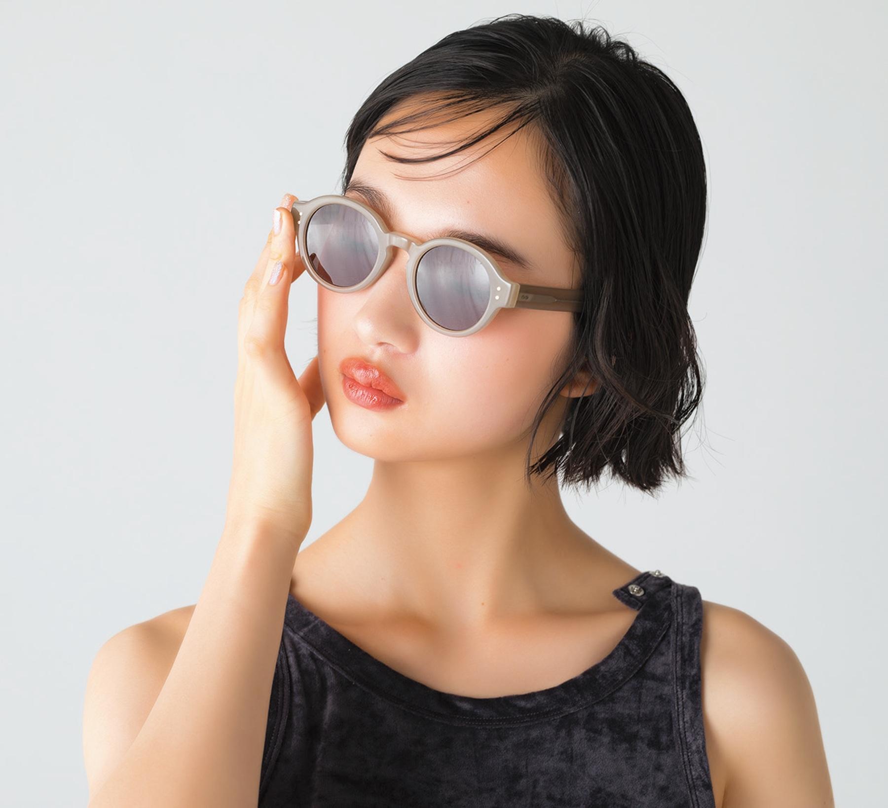 大きめのレンズがキュートなラウンドシェイプサングラス。旬のグレージュカラーをまとったセルフレームは透明感があり、主張のあるデザインながら軽やかな印象に。