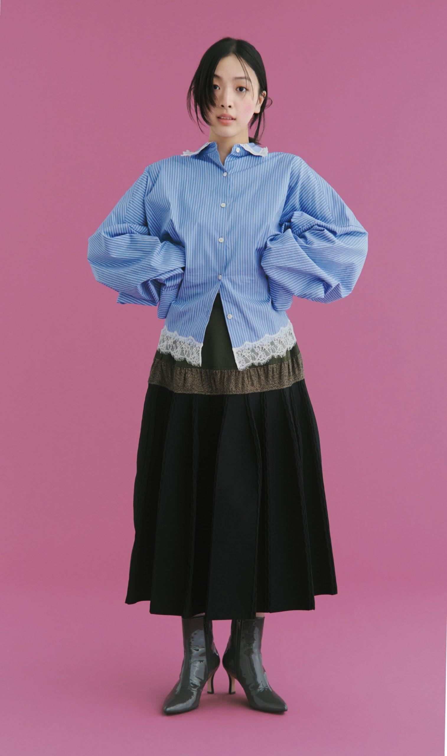 ウエストシェイプされたシャツでスカートのシルエットが際立つ