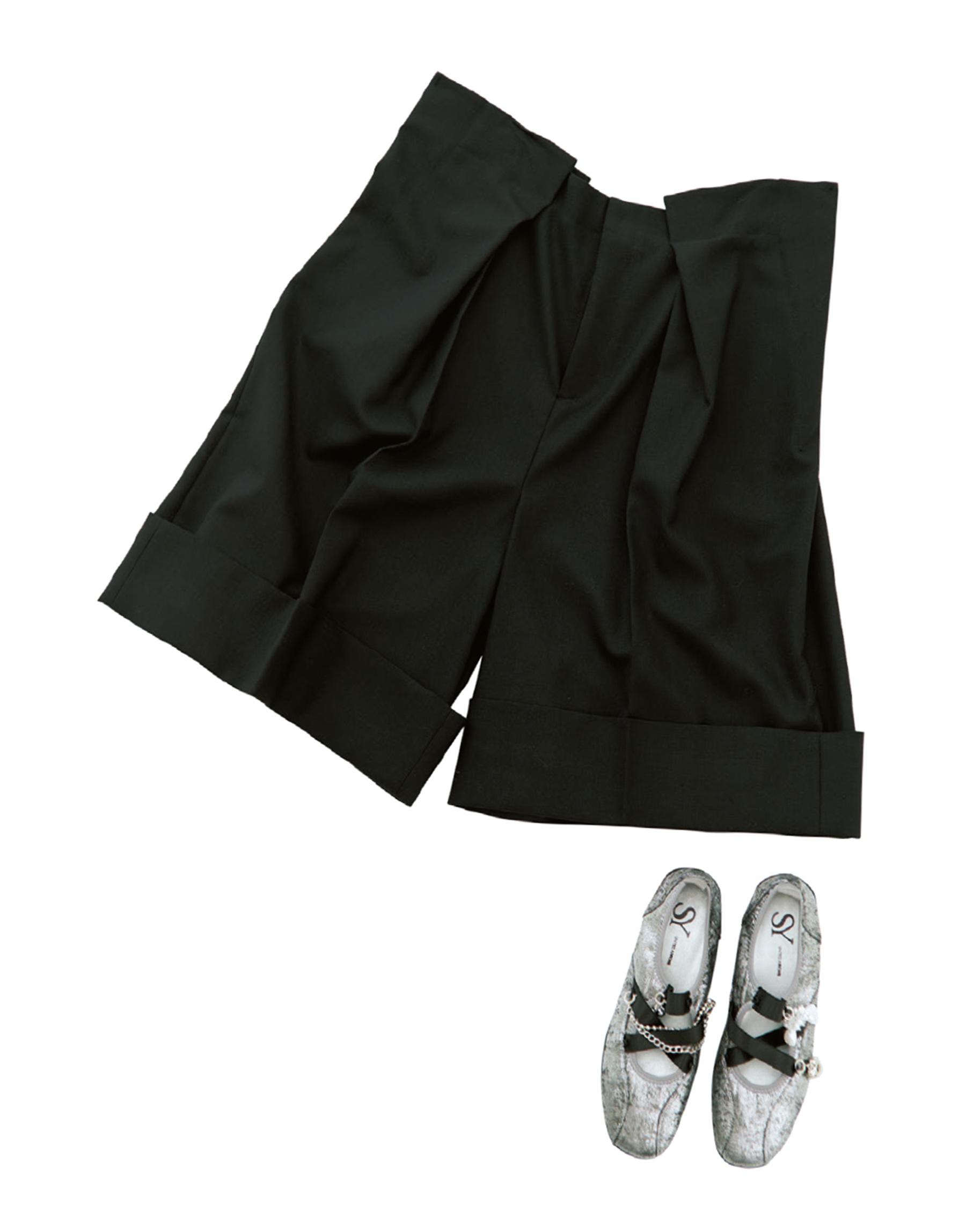 ハーフパンツ¥42,900(エンフォルド TEL. 03-6730-9191) バレエシューズ¥13,970(シー ユナイテッドアローズ/ユナイテッドアローズ カスタマーサービスデスク TEL. 0120-559-652)