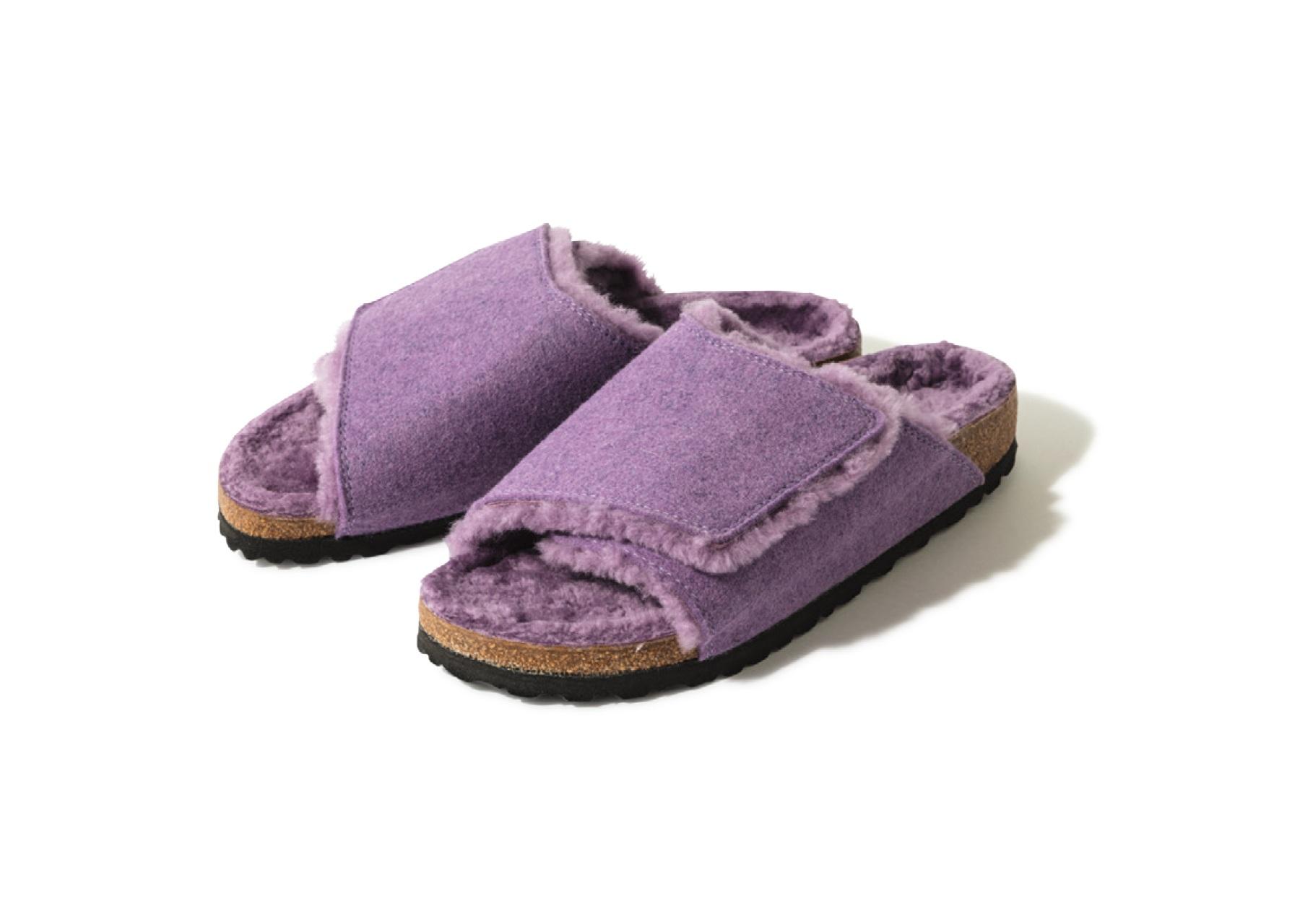 少しくすんだパープルと暖かいボア素材で、秋らしい装い。スリップオン型なのでサッと履けるのも嬉しい。