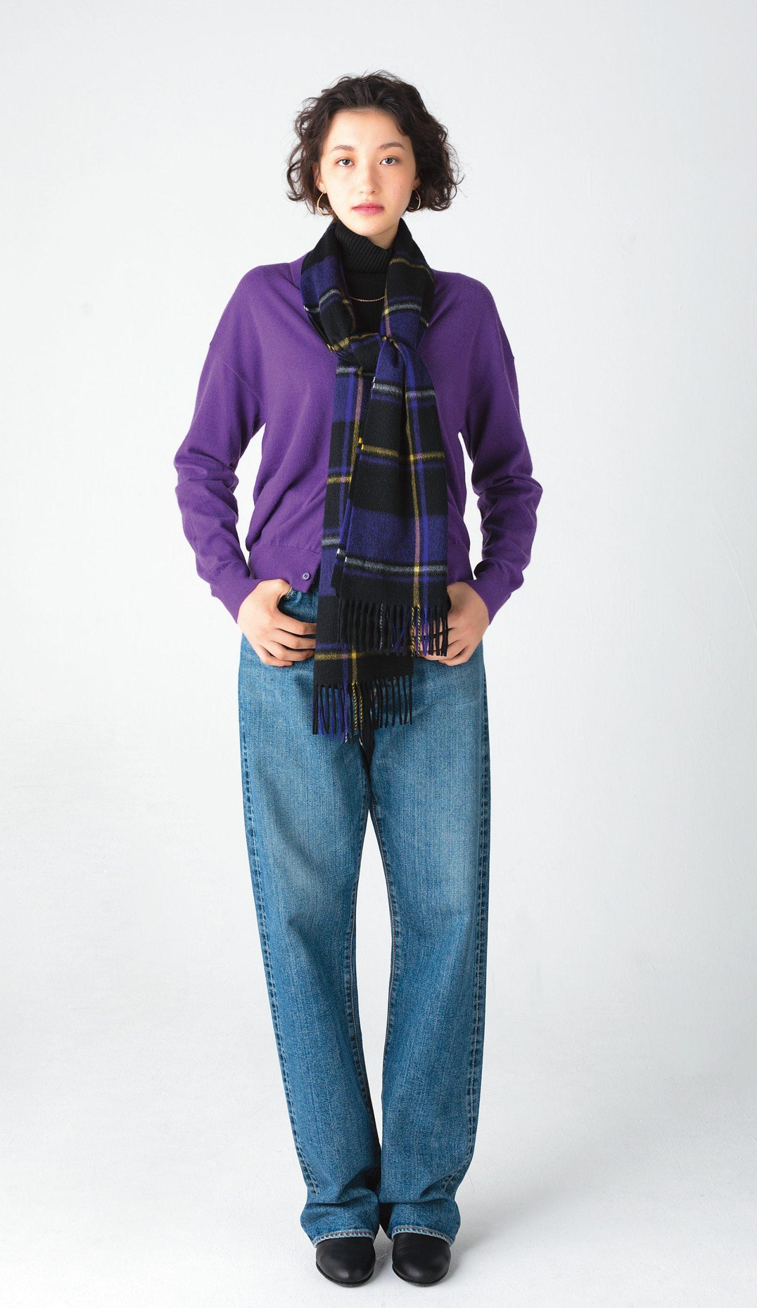イギリスの老舗テキスタイルブランドのマフラーは、深みのあるタータンチェックがシックな雰囲気。