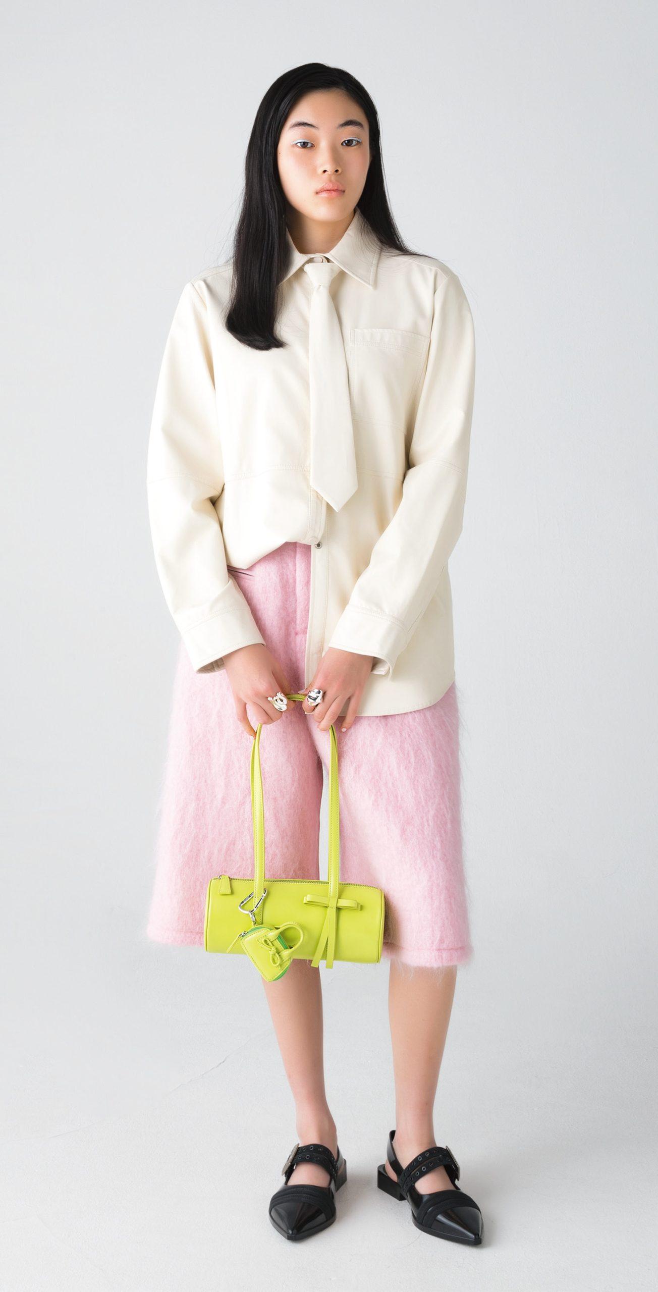 丸いフォルムがかわいいバレル型のハンドバッグは、長めのハンドル付きで肩がけも可能。付属のリボンモチーフが愛らしく、同素材のチャームを付ければ、さらにデコラティブな表情に。バッグ ¥84,392 ミニチャーム ¥22,792(共にサンディ・リアング/リディア TEL. 03-3797-3200) タイ付きシャツ ¥18,920 パンツ ¥24,200(共にメゾンスペシャル/メゾンスペシャル 青山店 TEL. 03-6451-1660) シューズ ¥15,400(メリッサ/メリッサ シューズ ジャパン TEL. 03-6712-6187)