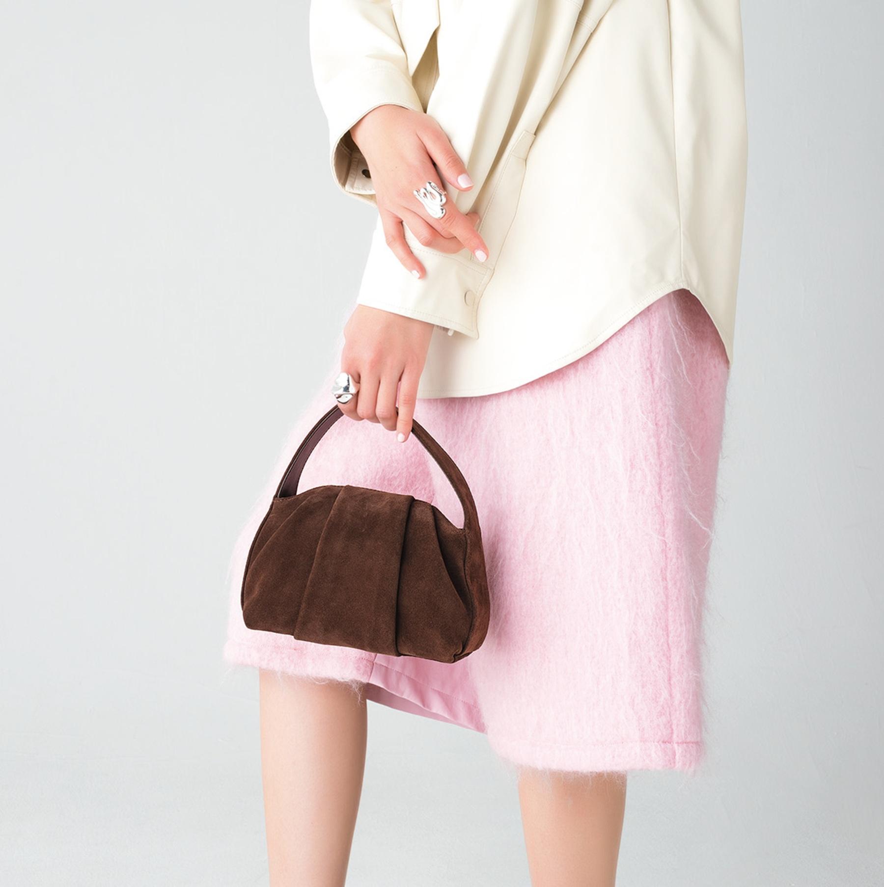 まるでリボンのようなシャーリングデザインも印象的。ショルダー付きバッグ ¥24,800(ルメン/ピーアールワントーキョー TEL. 03-5774-1408) リング、右手 ¥9,790 左手 ¥9,790(共にピルグリム/ズットホリック)