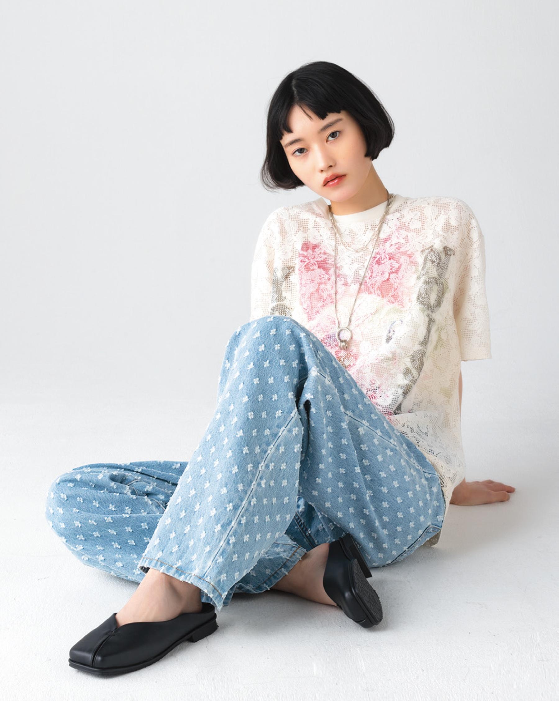 ジャカード織の小ぶりな柄が主張しすぎず、上品な雰囲気。パンツ ¥14,300(レイ ビームス/レイ ビームス 新宿 TEL. 03-5368-2191) トップス ¥30,800(トーキング アバウトジ アブストラクション/ブリゲイドデザイン TEL. 0727-34-8284) チェーンネックレス ¥94,600 アイグラスホルダー ¥30,800(共にエンド カスタム ジュエラーズ×ハイク/ボウルズ TEL. 03-3719-1239) シューズ ¥14,300(タジャ/ティースクエア プレスルーム TEL. 03-5770-7068)