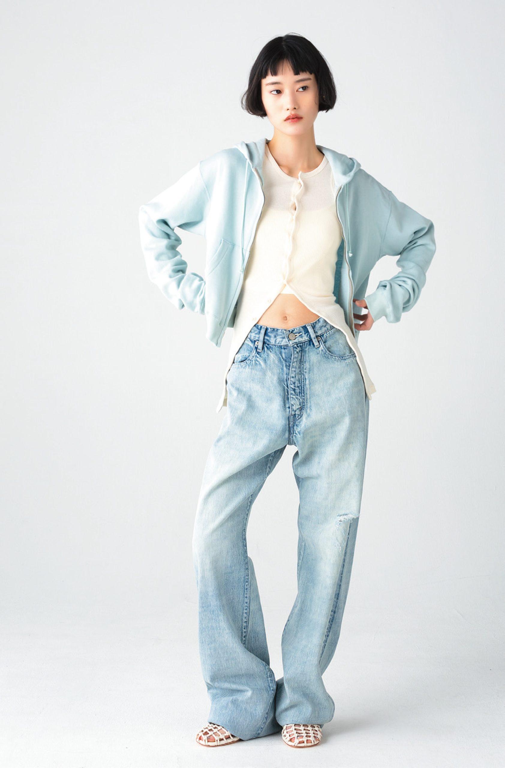太すぎず、細すぎない絶妙なシルエットが魅力。ベーシックで着回し力の高いデニムは、ワードローブに備えておきたい一本。パンツ ¥52,800 ジップパーカ ¥37,400 タンクトップ ¥22,000(以上オーラリー TEL. 03-6427-7141)