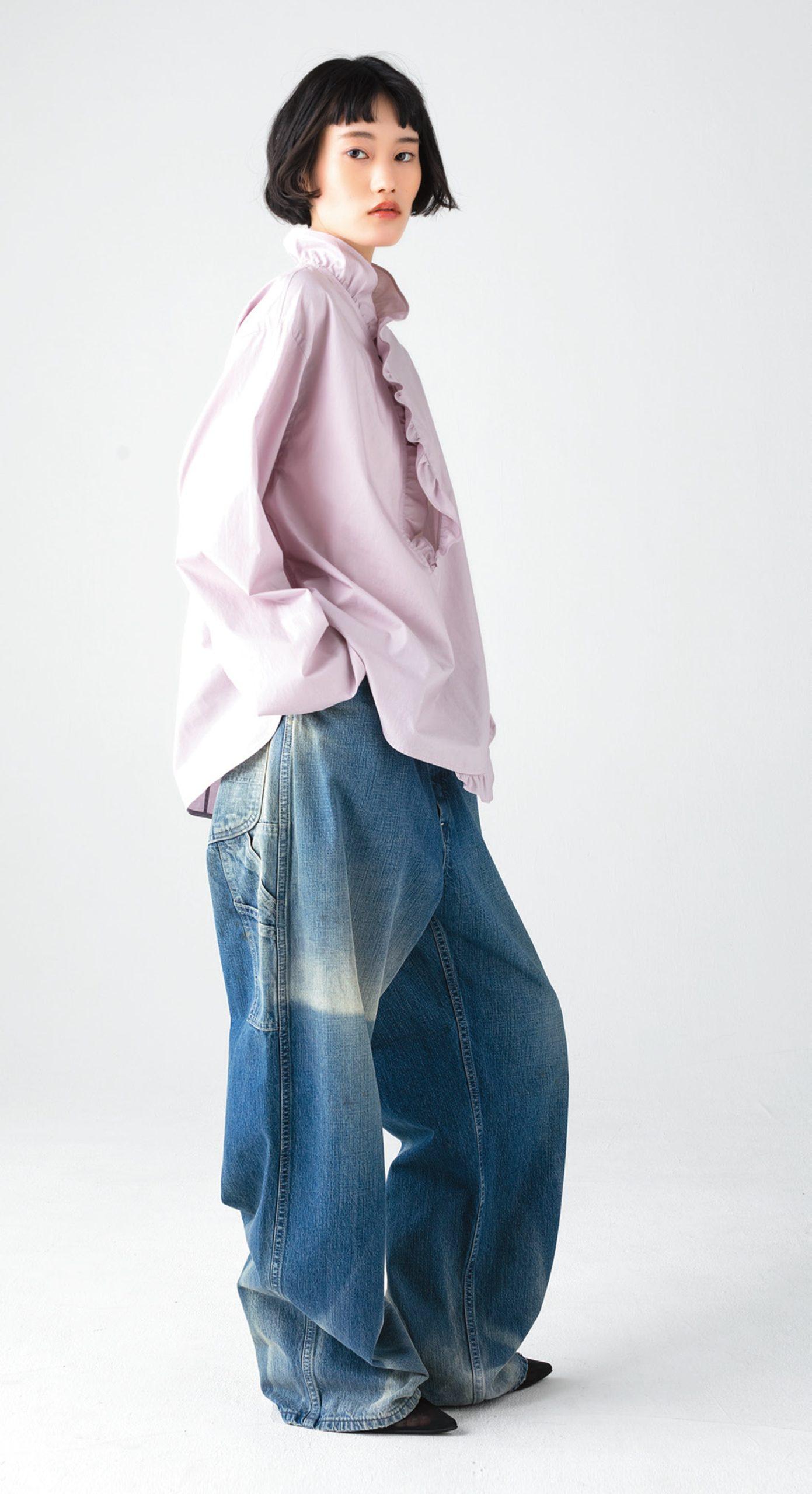動きやすいルーズシルエットにハードなウォッシュ加工が特徴のペインターパンツ。Tシャツに合わせてカジュアルに着こなすのはもちろん、あえてきれいめのシャツやブラウスに合わせても、こなれた表情に仕上がる。パンツ ¥26,400(リー/エドウイン・カスタマーサービス TEL. 0120-008-503) ブラウス ¥33,000(ロエフ/エイチ ビューティー&ユース TEL. 050-8890-9491) ミュール ¥20,900(モリーニ/ジャック・オブ・オール・トレーズ プレスルーム)