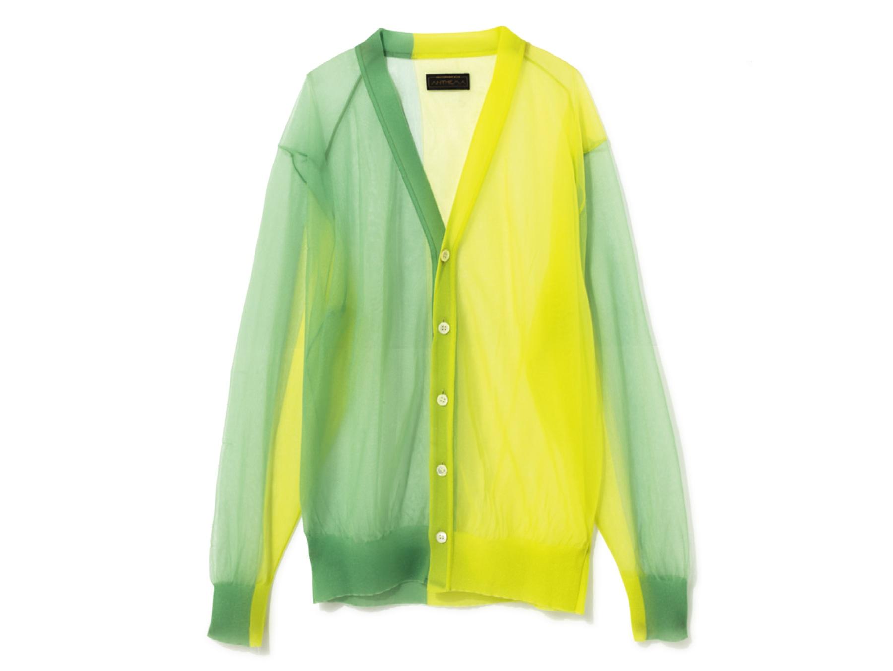 ライトイエロー×グリーンがフレッシュな印象のカーディガン。上品に肌が透けるシアー素材で、春先から夏場の羽織りとしても重宝する。¥42,900(アンセム エー/エンケル TEL. 03-6812-9897)