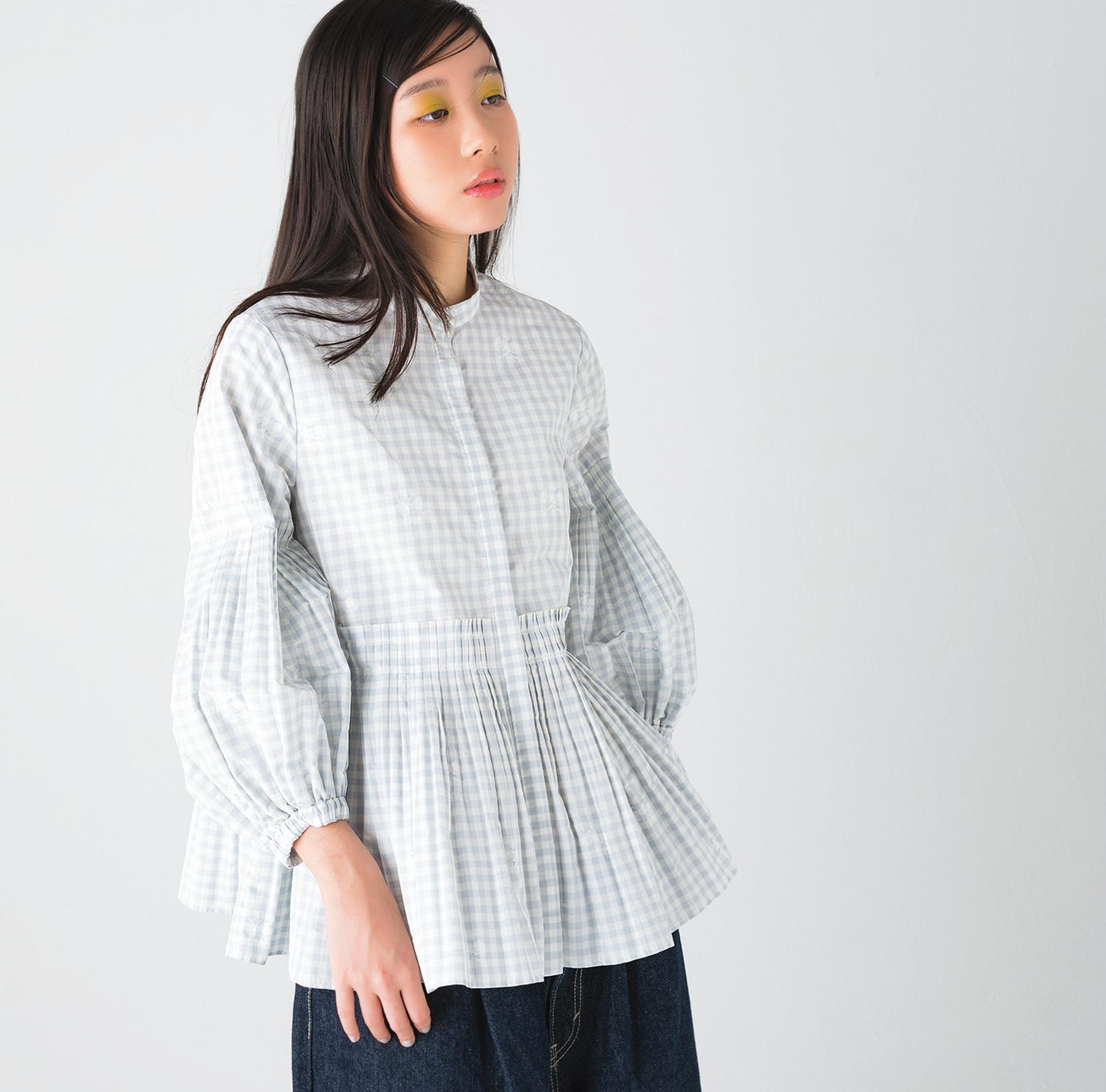 ライトグレーのギンガムチェックが上品な印象のブラウス。袖と裾にあしらわれたプリーツが美しく、生地をよく見ると花の模様の刺繍が。 ¥33,990(ユナイテッドアローズ/ユナイテッドアローズ 渋谷スクランブルスクエア店 TEL. 03-5774-1030)