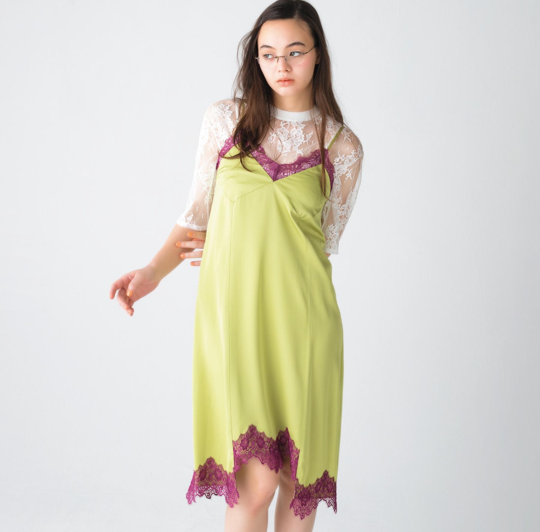 センシュアルなサテンのキャミドレス。美しい光沢と配色で、装いの鮮度が急上昇。ワンピース ¥47,300(アンセムエー/エンケル TEL. 03-6812-9897) 眼鏡 ¥63,800(ayame for Continuer/コンティニュエ TEL. 03-3792-8978)