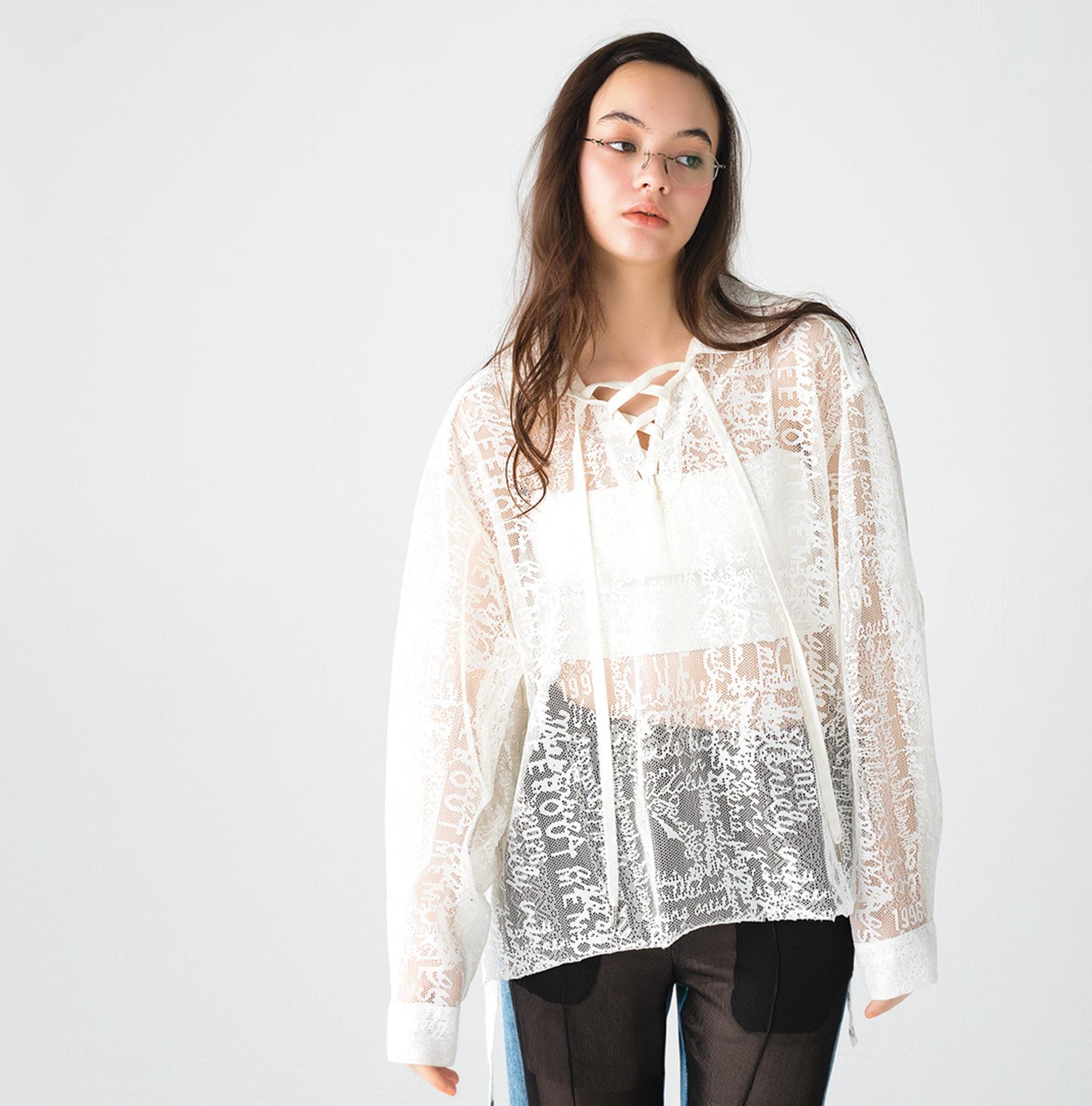 今季のテーマ“MEMORIES”にちなんで、デザイナーの少年時代の記憶を文字に起こし、グラフィックとして表現。ブラウス ¥44,000(セヴシグ/サカス ピーアール TEL. 03-6447-2762) パンツ ¥74,800(ムカサ info@studio-mukasa.com) インナーはスタイリスト私物
