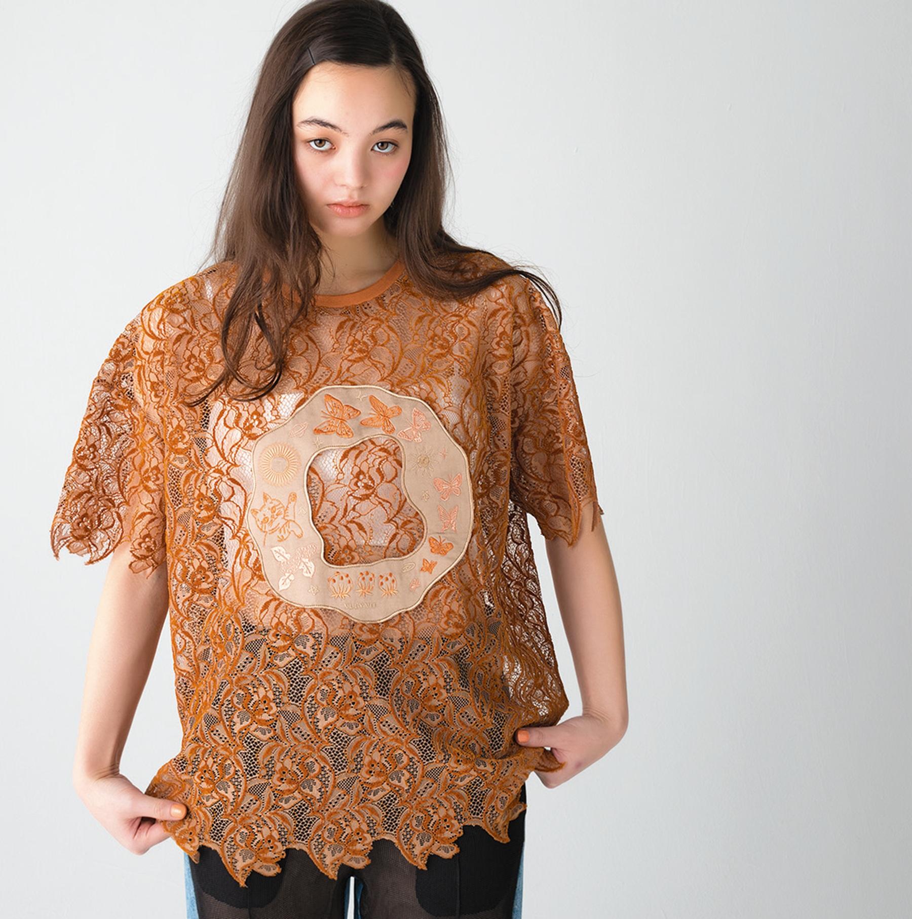 魔法使いの猫、蝶々、惑星など、オリジナリティ溢れる刺繍を施したTシャツ。透け感のある総レースで、合わせるインナーによって表情ががらりと変化。 ¥24,200(ヴィーエル・バイ・ウィー/ススプレス TEL. 03-6721-1341)