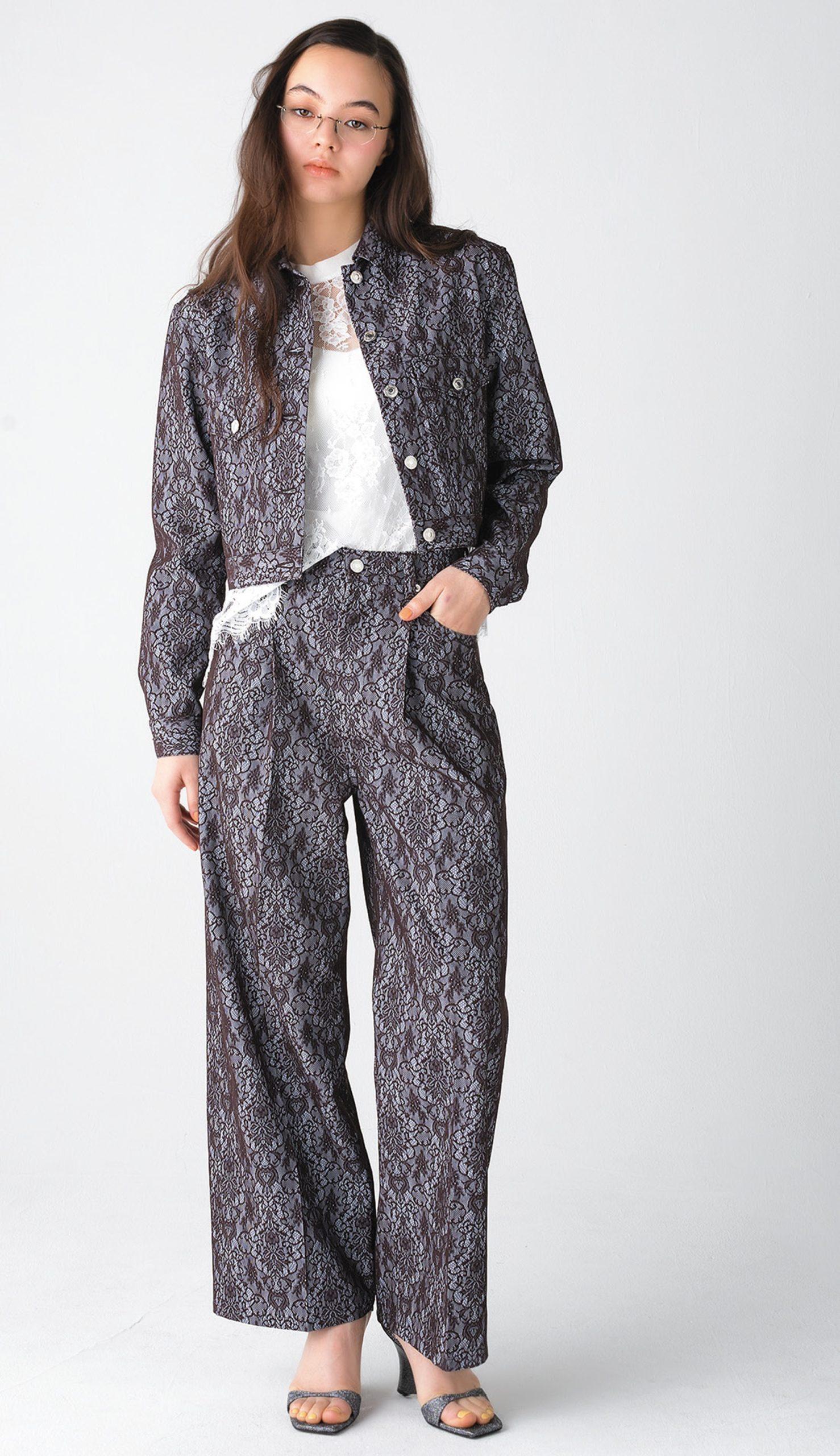 レースとデニムを接合したオリジナルの生地を使用。メンズライクになりがちなジャケットとワイドパンツも、レースの効果でノーブルな印象に。セットアップで着こなせば、コーディネートの完成度が大幅アップ。ジャケット ¥57,200 インナーキャミ付きトップス ¥27,500 パンツ ¥46,200(以上ティート トウキョウ/ザ・PR TEL. 03-6803-8313) サンダル ¥79,200(ディーゼル/ディーゼル ジャパン TEL. 0120-55-1978)