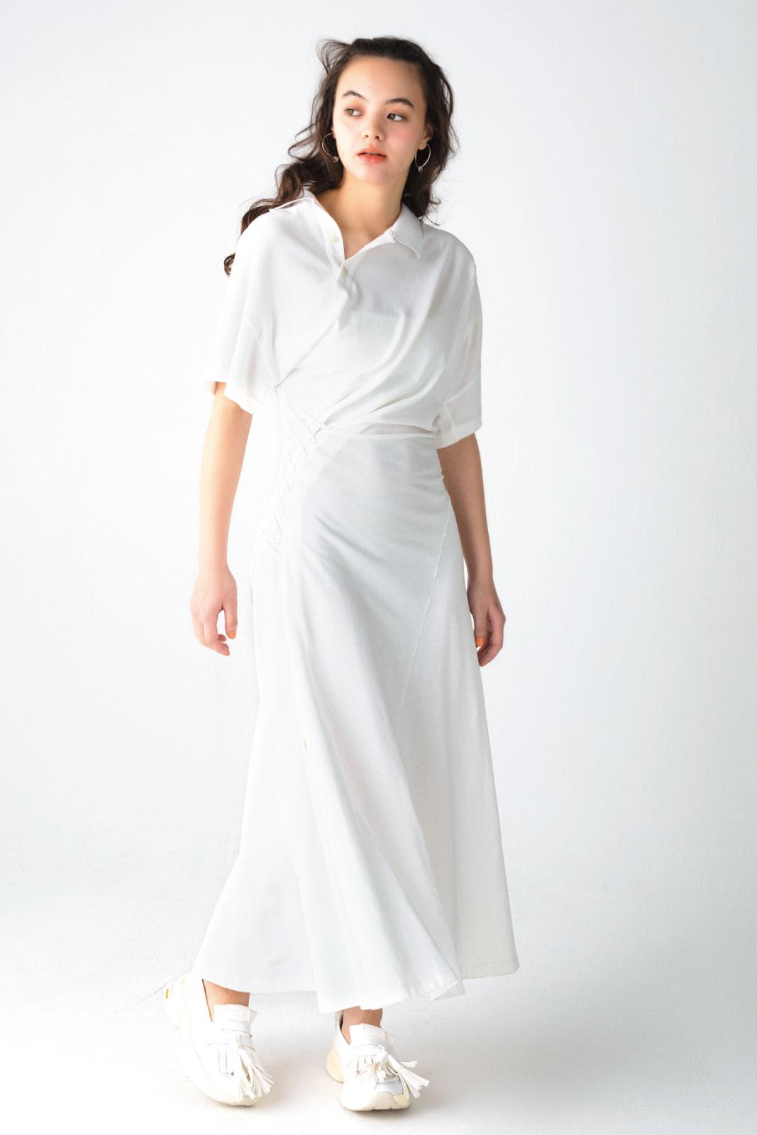 綿100%で作られた柔らかな生地が描くドレープは、歩くたびに優雅な雰囲気をつくり出す。アシンメトリーな襟も、さりげないアクセントに。スニーカーを合わせてカジュアルに外してもよし、パンプスで綺麗めに着こなすのもおすすめ。一着持っているだけで、春の装いが格段にランクアップ。ワンピース ¥73,700(アキコアオキ TEL. 03-5829-6188) スニーカー ¥48,400(ロドリリオン/ネペンテス ウーマン トウキョウ)